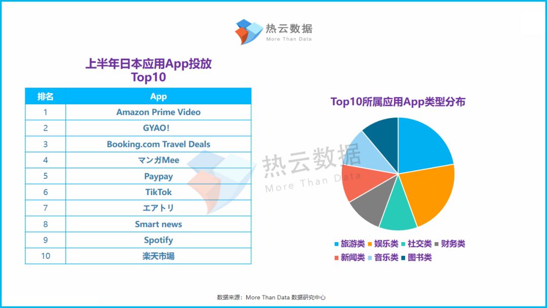 以下为日本上半年应用App投放创意组数量Top10排名。按其所属类型来看,10个App涉及到7个应用App类型。这与美国Top10的类型分布情况相同。其中,娱乐类的Amazon Prime Video与GYAO!排在第1、2名。日本Top10排名中,有两款App同时也是美国Top10——它们是抖音(TikTok)与音乐类App–Spotify。