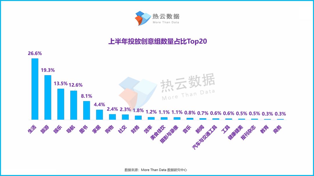 投放创意组数量占比的维度上,生活类App是投放量最多的品类,旅游类App排名第二。与美国投放创意组Top类型相比来看,日本应用App市场上导航与图书类App的投放量占比超过美国,排在第四、五位。另,根据各月投放量Top3类型来看,生活类与旅游类基本占据各月No.1,而家居类App在Q2的投放量增长较为明显。