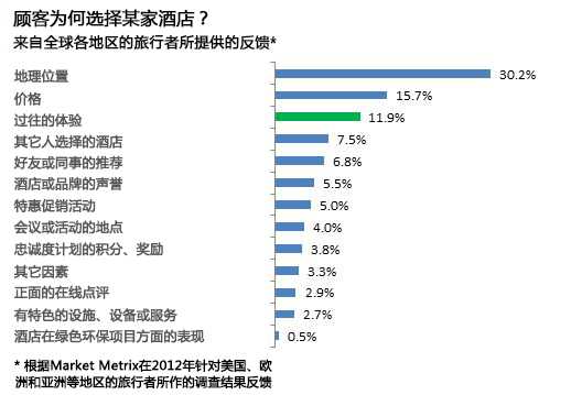 在全球市场,“过往的体验”在顾客制定酒店决策的过程中发挥着更为重要的作用(11.9%的受访者称其重视这一因素),其重要性高于好友的推荐(6.8%)、品牌的声誉(5.5%)、促销活动(5.0%)、忠诚度计划的力量(3.8%)以及在线点评(2.9%)对顾客选择酒店的影响。