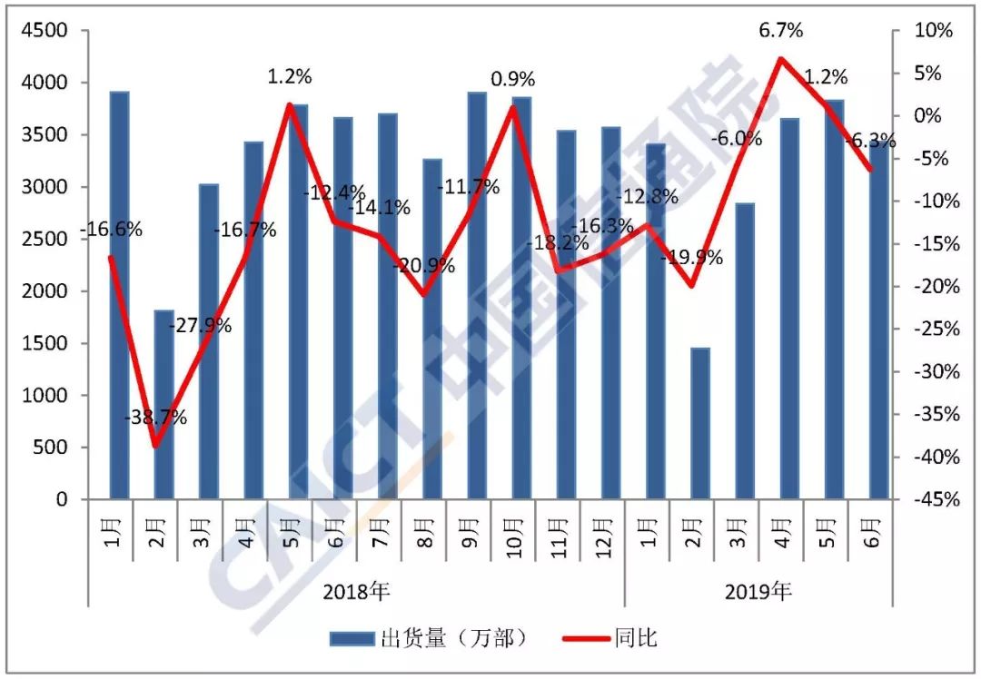 2019年6月,国内手机市场出货量3431万部,同比下降6.3%,上市新产品38款,同比下降48.6%;2019年上半年,国内手机市场出货量1.86亿部,同比下降5.1%,上市新产品246款,同比下降38.0%。2019年6月,国内5G手机已成功上市。