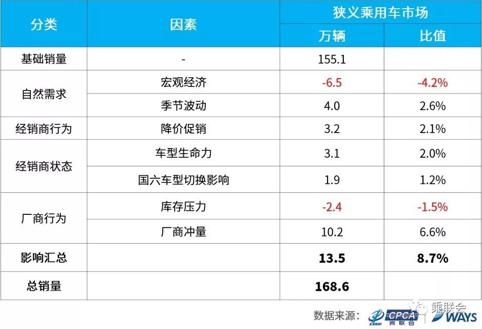 用量化方法将影响批发量的主要因素拆解后可知,影响2019年6月狭义乘用车市场批发量的主要因素包括:厂商季度末冲量及季节性上升带来的批发增量;此外,宏观经济下压及经销商库存压力大导致一定的减量。