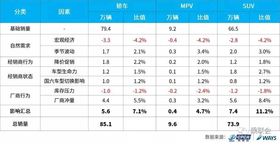 其次,相比2019年4月, MPV市场6月在基础销量上增量4.7%。季节性上升,带来3.4%的增量;为促动消费者购车,经销商降价促销,带来2.0%的增量;厂商冲量,加快批发节奏,贡献3.2%增量。此外,宏观经济下压,汽车市场消费不景气,造成4.2%的减量;市场零售差于预期,经销商库存压力上升,造成2.4%的减量。
