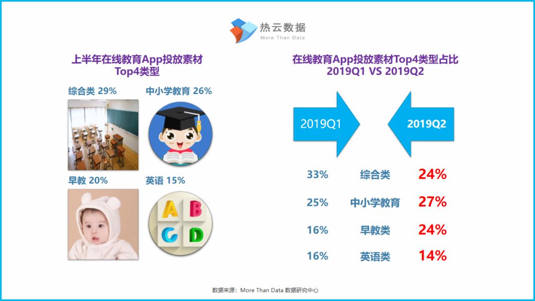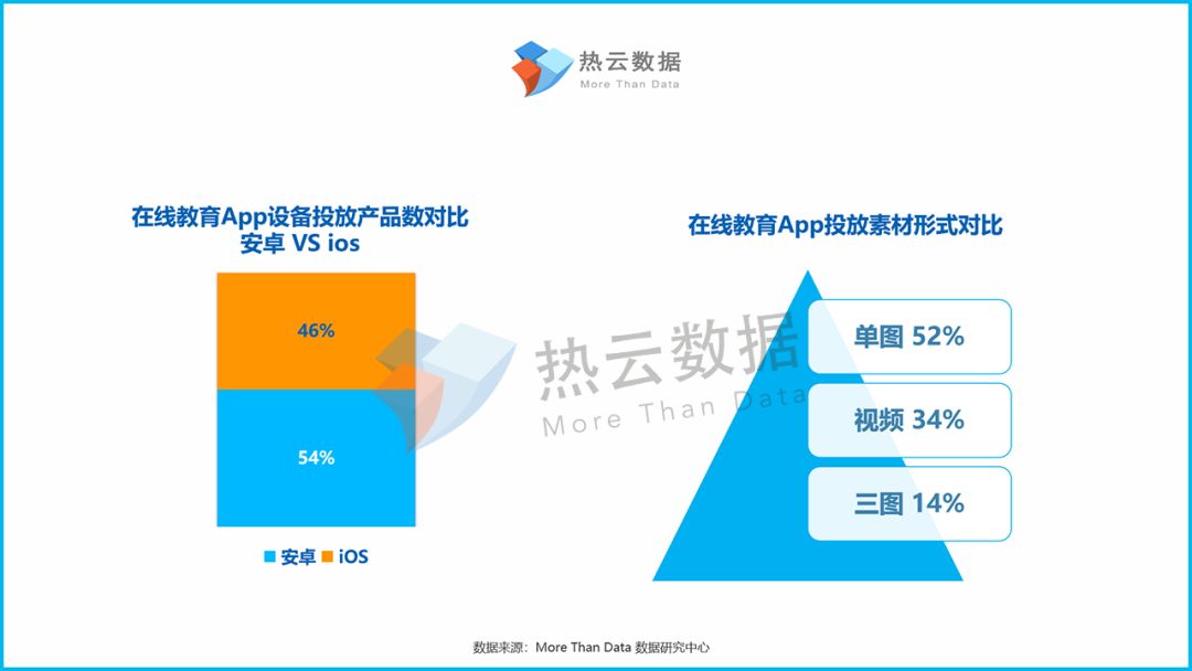 按在线教育App在两设备投放产品数量对比来看,在线教育App凭借其广泛的用户基础,安卓与ios投放产品数量的比例大体相同,安卓的比例为54%略高于iOS。此外,在线教育类App投放单图的比例为52%,视频与三图的比例分别是34%、14%。其中,单图素材形式比例较Q1的比例有所下滑,相反视频、三图素材形式占比有所增长。