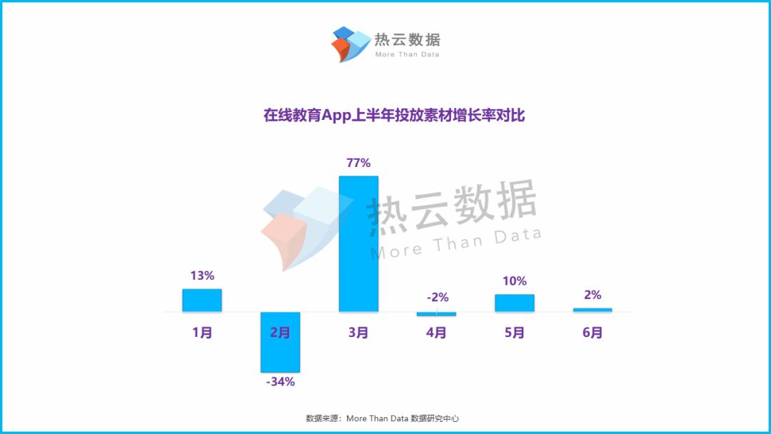 按投放素材数量占比的维度来看,总体Q2的平均投放素材量占比相比Q1进一步萎缩,平均占比为0.6%。此外,在线教育App行业各月投放素材数量增长率上,Q2较之Q1的平均情况同样有着明显的下滑。结合上述投放产品数量的情况,鉴于相关行业政策法规性以及社会舆论性的监管与关注愈发加强,这对于在线教育App行业投放起着较为明显的“降温”作用。