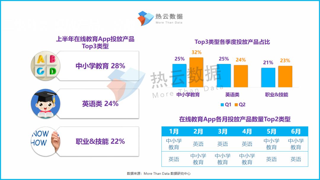 上半年在线教育类App的2级分类与投放产品数量之间交叉的维度来看,中小教育类App凭借在Q2期间的进一步增长,以28%的占比位居首位,成为在线教育App投放市场中投放App数量最多的在线教育类App类型;英语类App在上半年两个季度的变化相对稳定,以24%排名第2位。此外,通过对上半年各月在线教育类App投放产品数量Top2类型来看,前两名全部被中小学教育以及英语类App占据且交替成为No.1。其中,上半年临近期末的月份(1、5、6月)中小学教育类App便位居榜首;其余月份则英语类App“迎头赶上”。