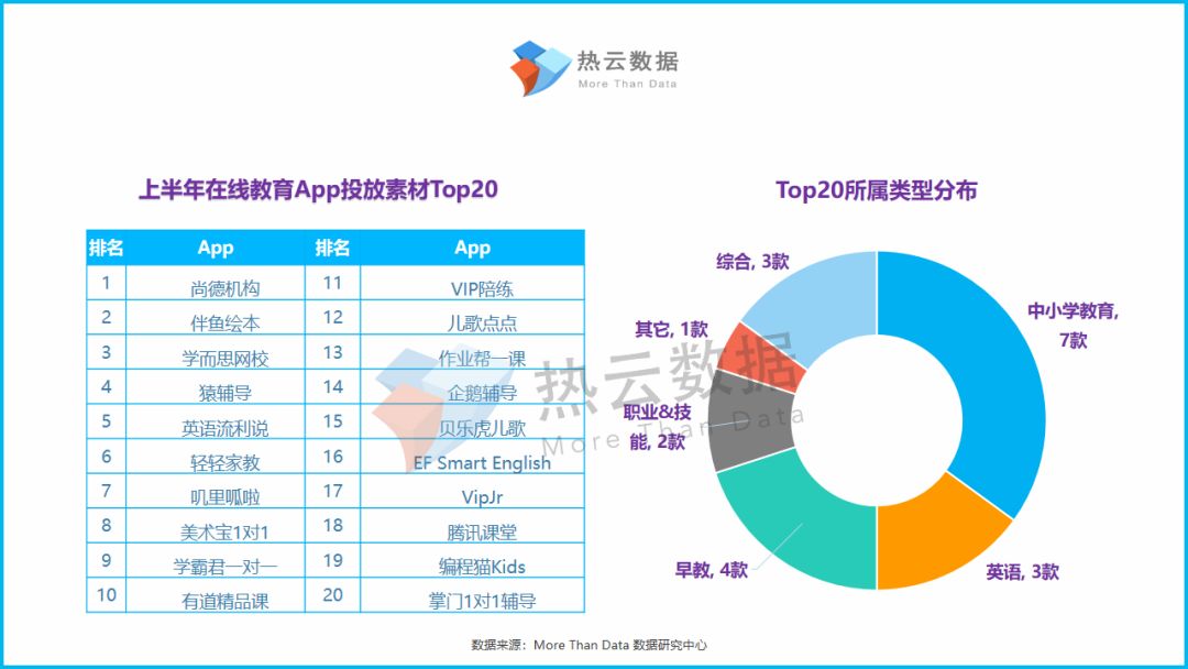 以下是上半年在线教育App投放素材Top20的具体排名。Top20中,除中小学教育类App较Q1的入选Top20的数量有所增长外,其余在线教育App的类型分布比较平均。(扫描报告结尾热云小助手二维码并添加好友,获取完整版报告,即可了解“上半年在线教育App投放素材Top50”)