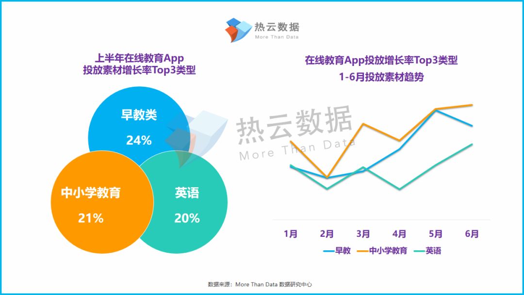 早教类App成为上半年投放素材数量增长率最高的在线教育类App类型,增长率为24%;位居其后的是中小学教育类App以及英语类App。按上述Top3类型的各月投放素材趋势图来看,早教类App自春节假期便一直处于高增长态势,临近6月份的“学期期末”,涨势才有所下滑;中小学教育与英语类App凭借自身与“学历教育”的定位,这两类App在头尾“学期开始&期末”两个时段增速十分明显。