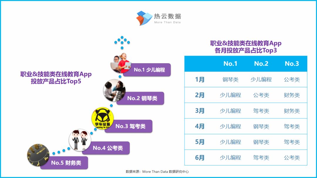 另,职业&技能类App在上半年投放产品数量占比排名第3位。具体来看,少儿编程类是该类App投放数量最高的细分类型。同时,少儿编程类App也是2-6月份投放产品数量最高的职业&技能类App;而总体排在次席的钢琴类App成为1月份的No.1。随着“天气逐渐回暖”,驾考类App在3-6月加大了招生宣传,均排进Top3。此外,公务员考试类App在上半年的年初与年中时段加大了投放力度。
