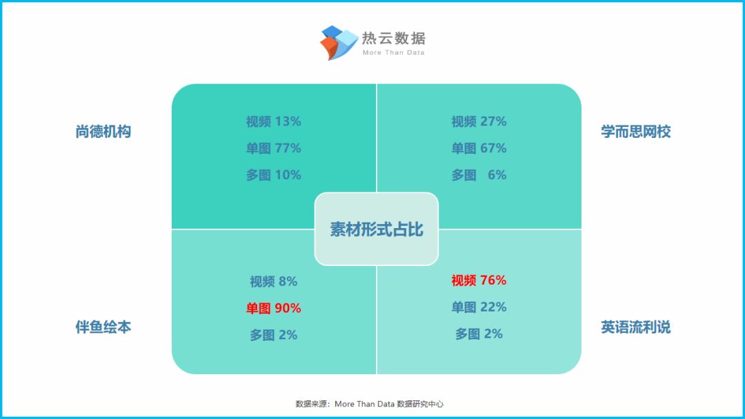 按4款App在上半年各自投放的素材形式占比来看,伴鱼绘本是4款App投放单图素材占比最高的App,英语流利说是视频素材占比最高的App。而其余两款App在三种素材形式中的占比,较为平均。