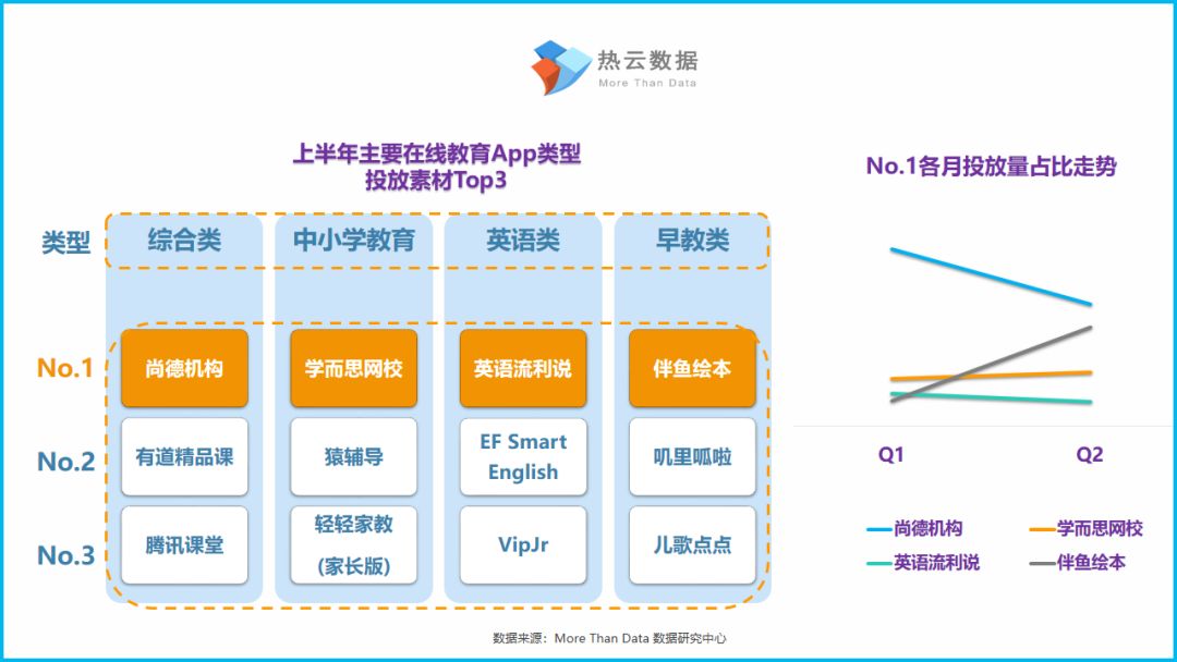 通过对在线教育App各主要类型投放素材量Top3的App进行梳理与对比,尚德机构、学而思网校、英语流利说以及伴鱼绘本分别是各类型上半年投放量最高的App。按下右图中的上述4款App两个季度投放量占比走势来看,尚德机构与伴鱼绘本“此消彼长”。尚德机构在Q1涨势很猛,而在Q2的投放量占比则开始出现回落的迹象。而其余2款App在上半年两个季度的投放相对平稳。