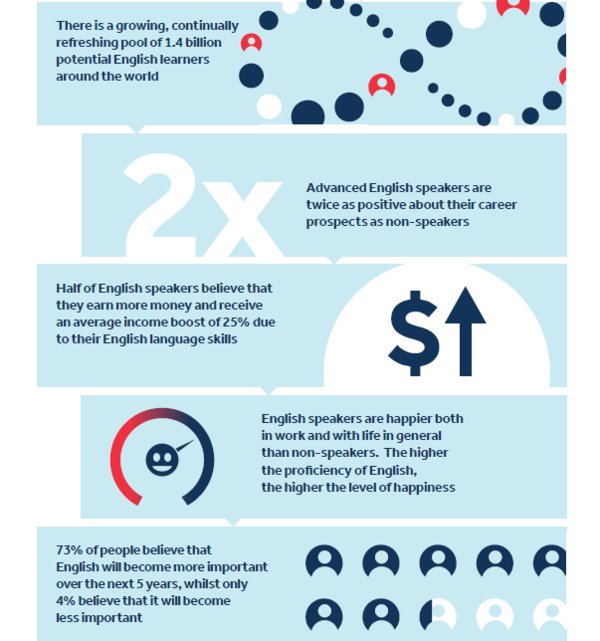 该报告还发现,英语能力可直接影响职位晋升和收入,英语熟练程度与人们工作和生活的快乐程度呈正相关,因此,寻求个人职业发展,是印度、中国等发展中国家英语学习的主要动力,包括中国在内的全球英语学习市场潜力巨大。
