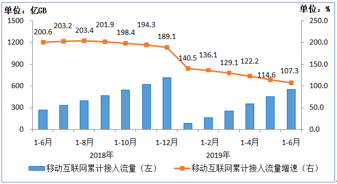 数据及互联网业务收入进入微增长通道。上半年,三家基础电信企业完成移动数据及互联网业务收入3086亿元,同比增长0.7%,增速较一季度和2018年全年分别回落1.5个和9.5个百分点,在电信业务收入中占45.9%,拉动电信业务收入增长0.34个百分点;完成固定数据及互联网业务收入1076亿元,同比增长2%,在电信业务收入中占16%,拉动电信业务收入增长0.31个百分点。