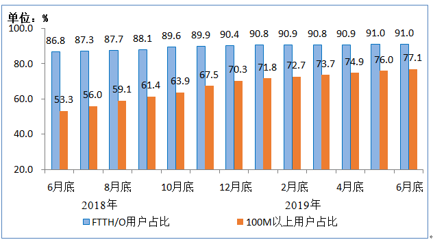 图3 2018年6月底-2019年6月底光纤接入(FTTH/O)和