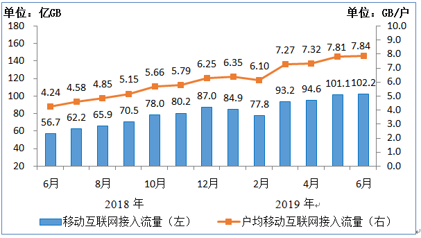 移动互联网流量保持翻倍增长,增速逐月回落。上半年,移动互联网累计流量达554亿GB,同比增速由一季度129.1%降至107.3%;其中通过手机上网的流量达到552亿GB,占移动互联网总流量的99.6%,同比增速由一季度133.2%降至110.2%。6月当月户均移动互联网接入流量(DOU)达到7.84GB,同比增速由一季度121.1%降至85%。行业流量增速高位运行,但增长趋势进入下行区间。
