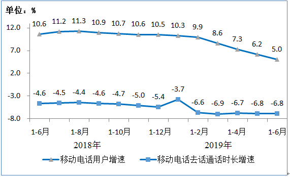 移动电话通话量降幅趋于平稳。上半年,移动电话去话通话时长完成11969亿分钟,同比下降6.8%,降幅较一季度和2018年全年分别扩大0.1和1.4个百分点;固定电话主叫通话时长完成614亿分钟,同比下降19.3%。