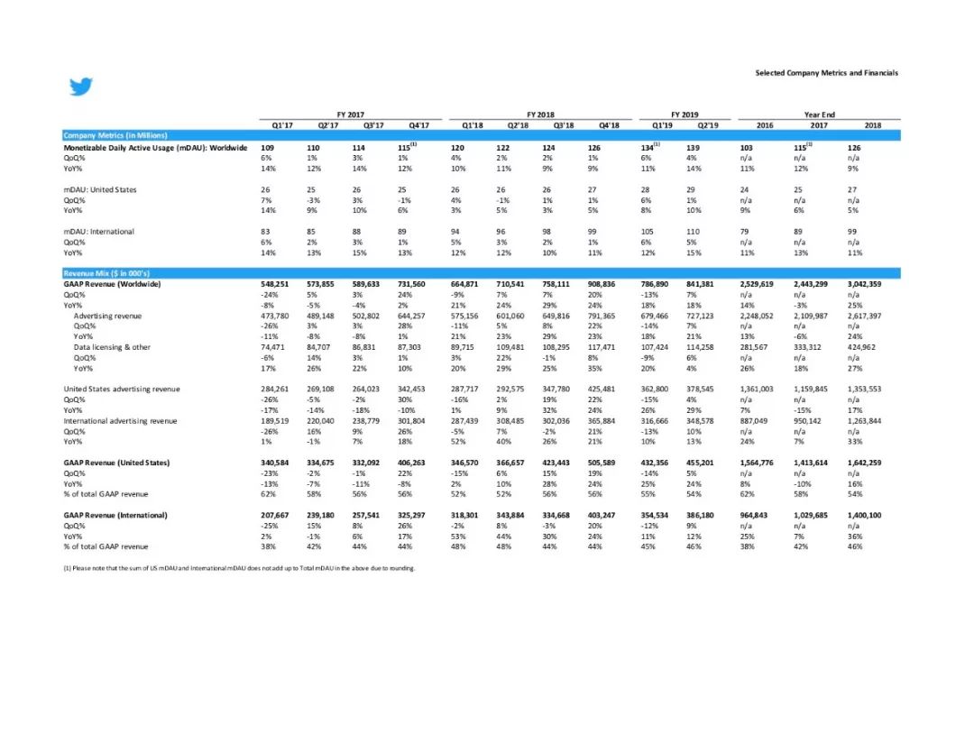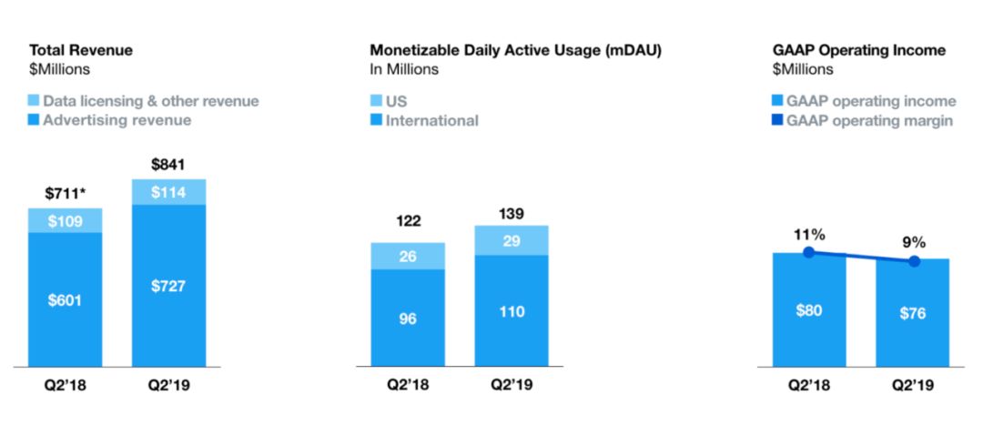 根据Twitter发布的2019年2季度财报,Twitter又迎来了一个强劲增长的季度。因美国市场表现突出,营收同比增长18%至8.41亿美元,营收的强劲增长让利润好于预期,运营利润达到7600万美元,运营利润率达到9%。