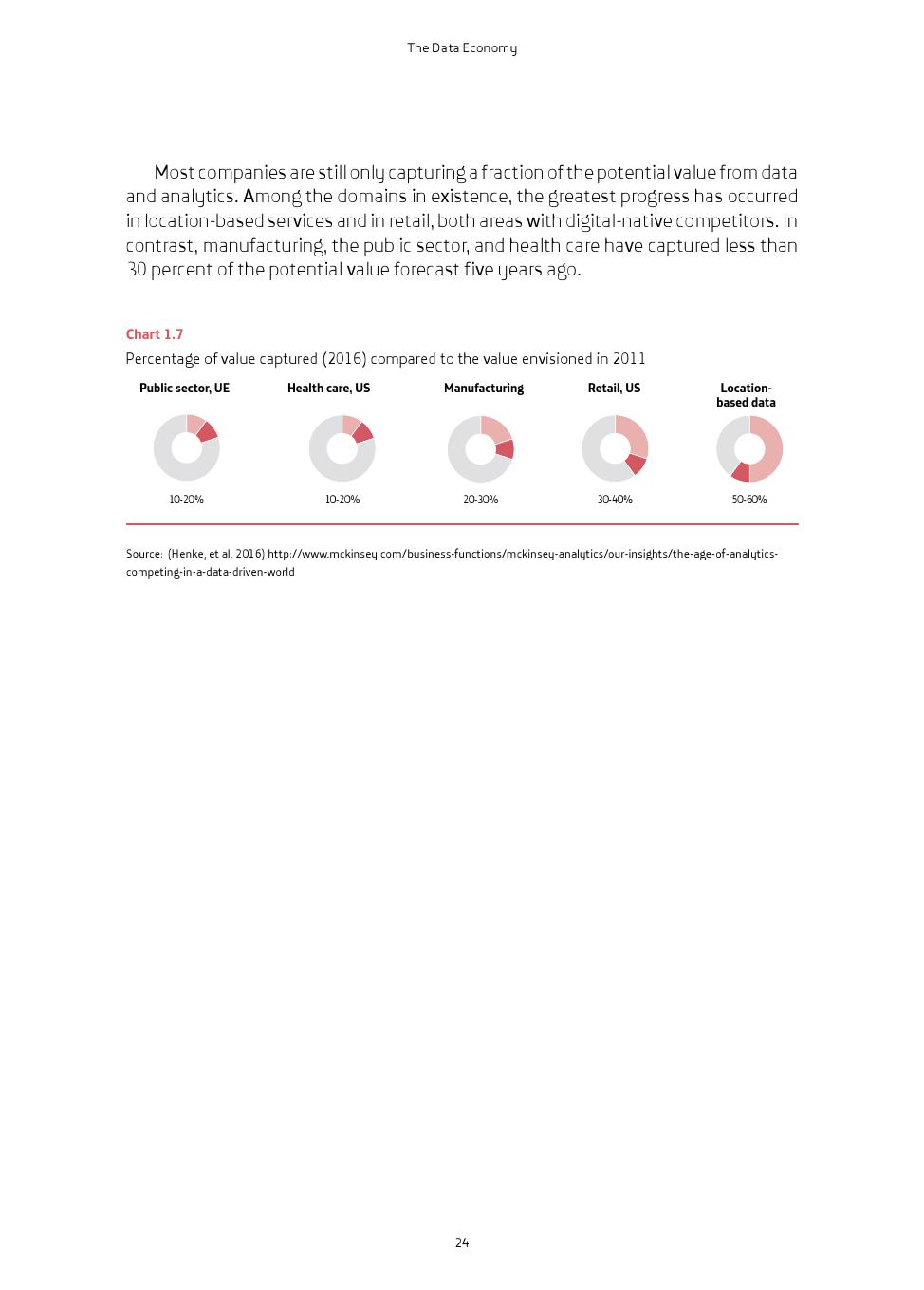 欧盟委员会估计,2015年欧盟(EU)的数据经济达到272亿欧元。麦肯锡2016年估计,2025年欧洲数据经济的国内生产总值可能增加2.5万亿美元。就美国而言,麦肯锡估计,到2025年,物联网、数据分析和在线人才平台可能会为美国经济带来2.2万亿美元GDP。