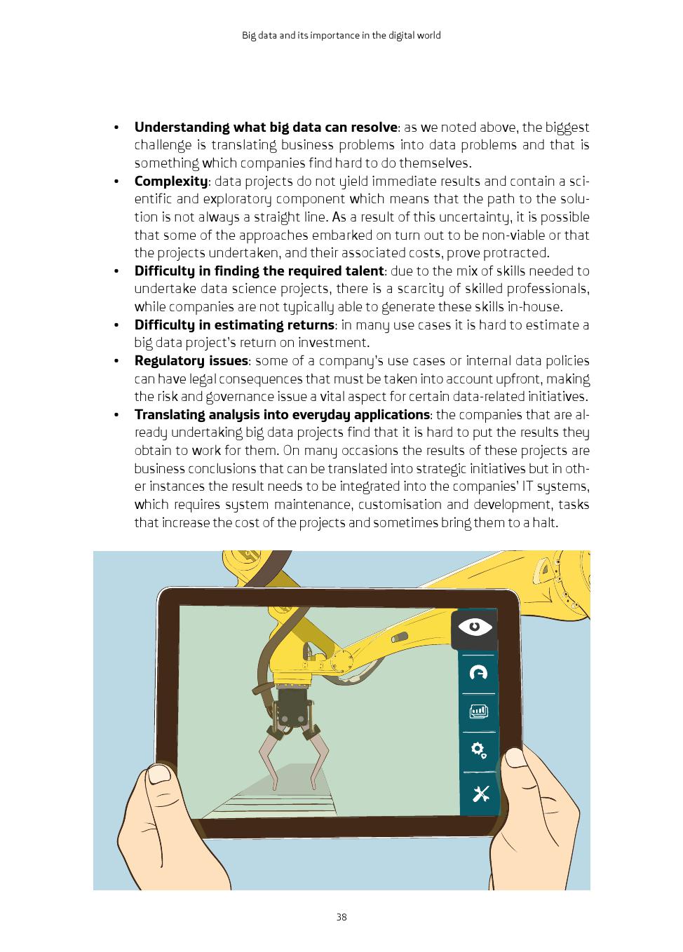大数据的优点是明确的,现在大多数公司都意识到它的价值。但是,还是存在着一些障碍:不了解大数据可以解决什么问题;复杂性;难以找到所需的人才;难以估计回报;监管问题;如何将专业分析转化为日常应用。