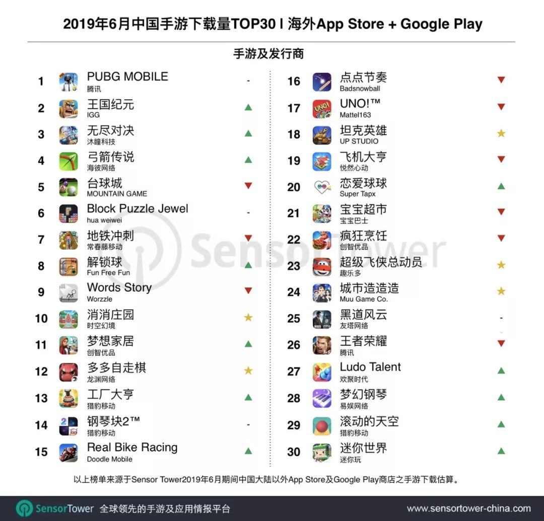 Sensor Tower 最新数据显示,2019年6月期间中国手游产品在海外市场下载量排名TOP30。本月亮点:龙渊网络《多多自走棋》,《英雄坦克》,《超级飞侠总动员》,《城市造造造》等5款游戏首次入围榜单,详情如下。