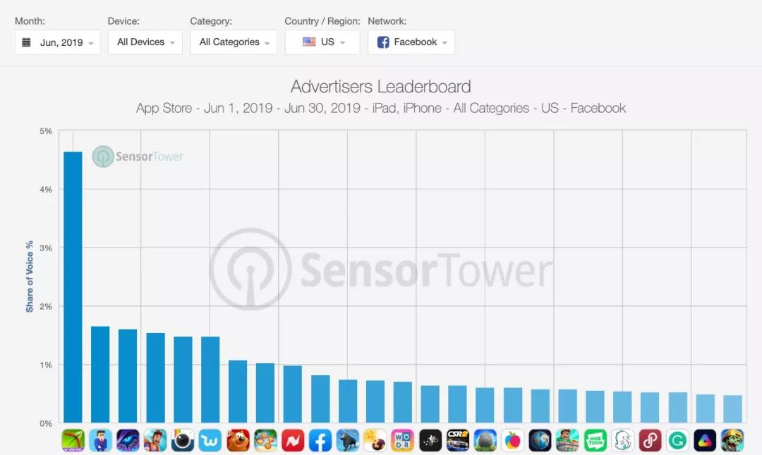 在商业模式被成功验证之后,《弓箭传说》开始在海外市场强势买量,该游戏为6月美区Facebook渠道iOS平台广告占有率最高的移动应用。从买量策略来看,目前该游戏集中开拓消费力高的海外市场,6月下载量前三名是美国,韩国和日本,分别占比20%,15%和10%。平台方面,iOS 和 Google Play占比分别为38%和62%。
