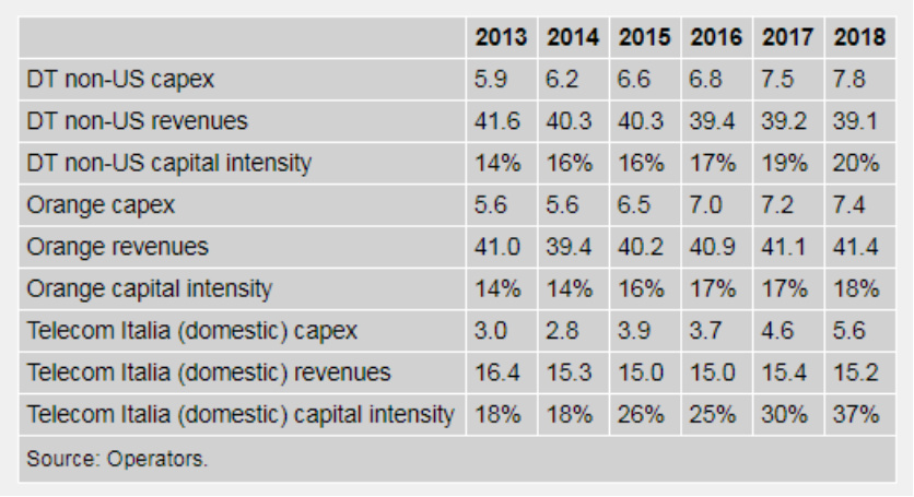 但是,运营商必须付出一些代价。不包括其庞大的美国业务(也即T-Mobile US)在内,德国电信的资本密集度(资本支出占收入的百分比)已经从2013年的14%飙升至去年的约20%。在同一时期,Orange则已从14%上升至18%。意大利电信的国内业务增幅最大,其资本密集度从2013年的18%飙升至2018年可能创纪录的37%,其中包含了频谱费用。这些数字不能无休止地上升。