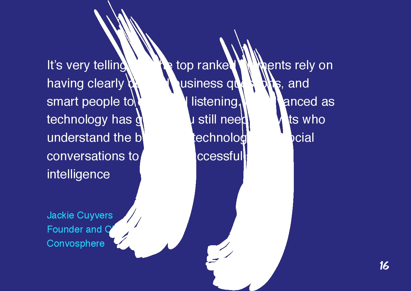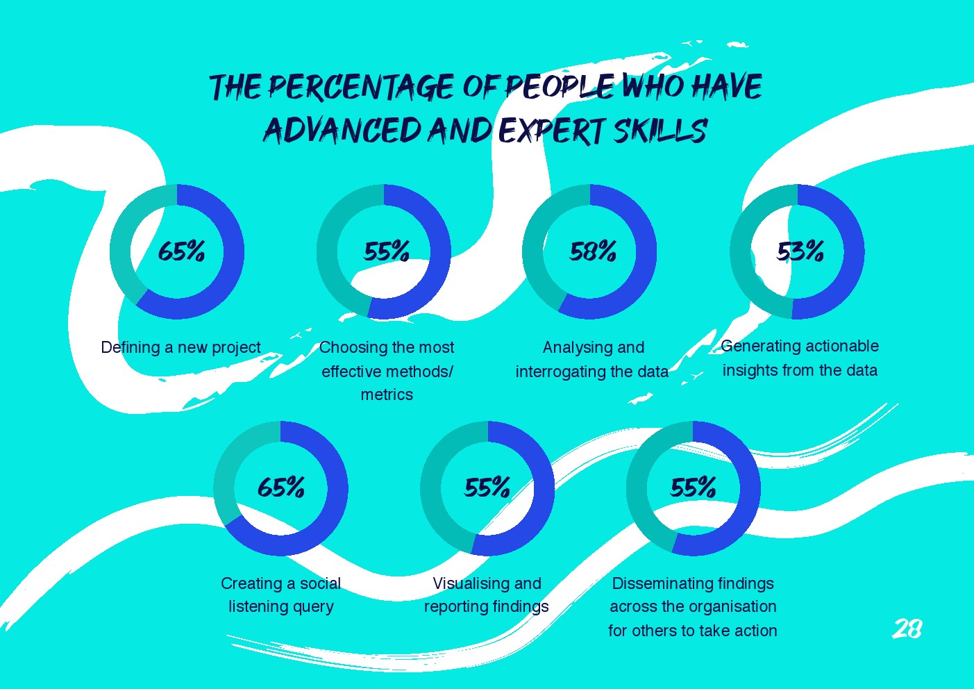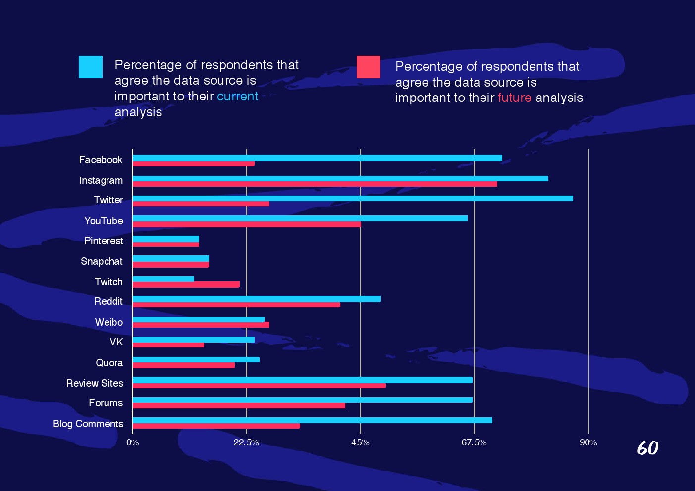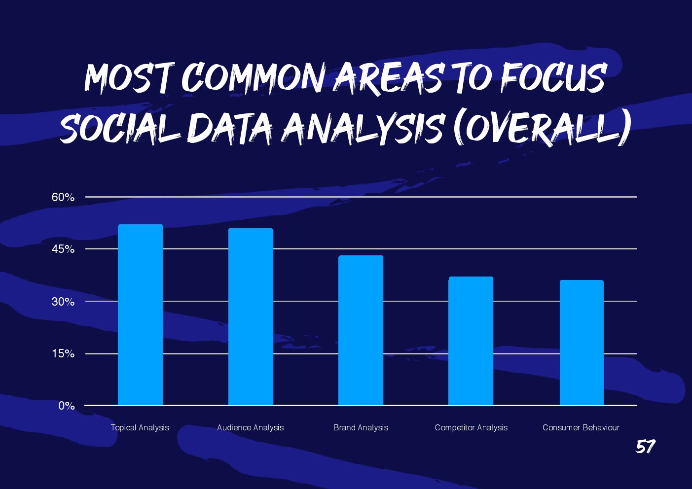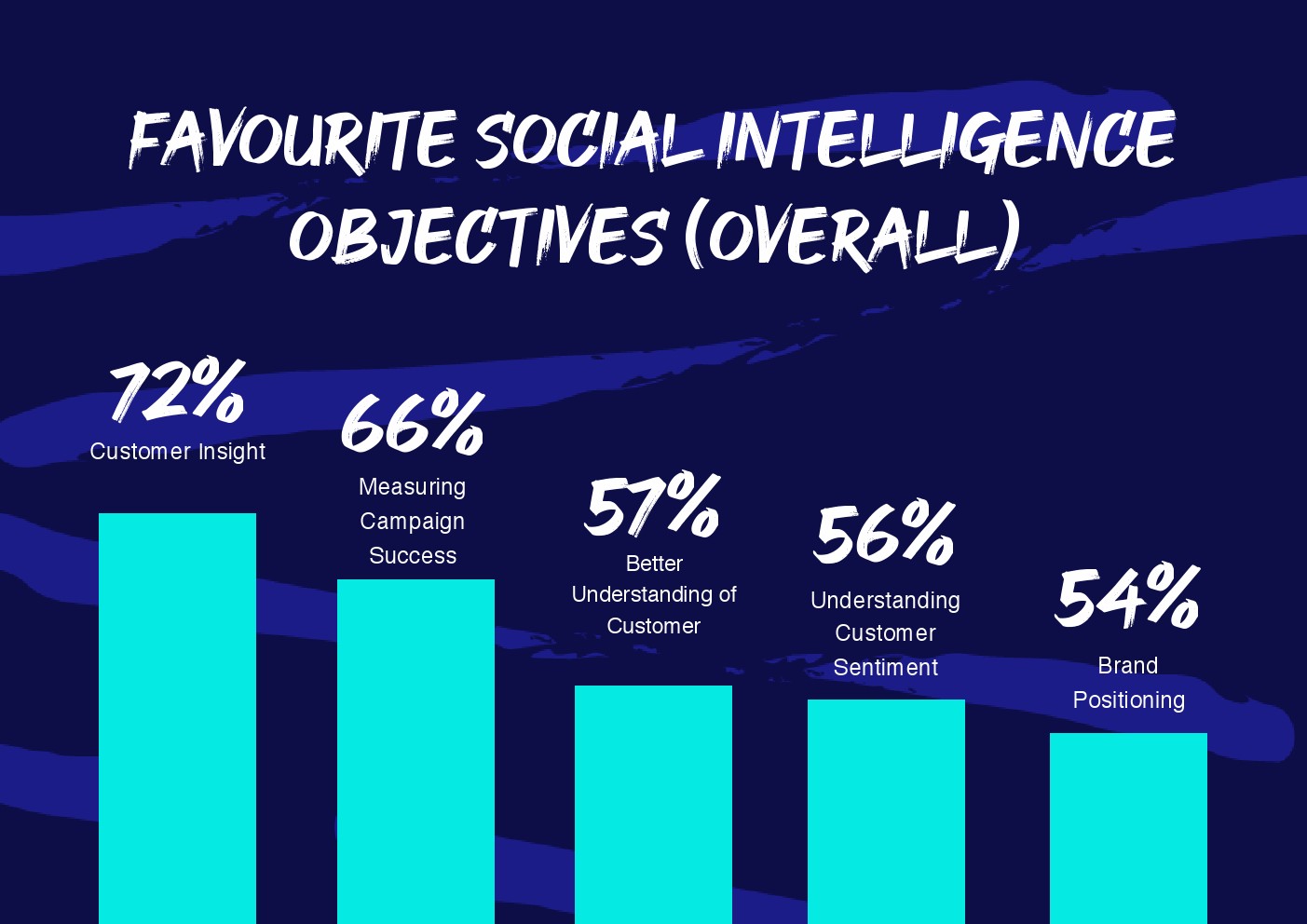 72%的受访者将客户洞察力确定为首要目标之一,其次是衡量活动成功与否(66%)。其他目标还包括更好地理解客户(57%),理解客户情绪(56%)和品牌定位(54%)。