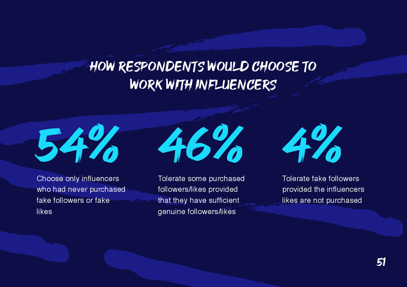 超过一半的受访者(54%)表示,他们只会选择从不获取虚假追随者或假赞的意见领袖。