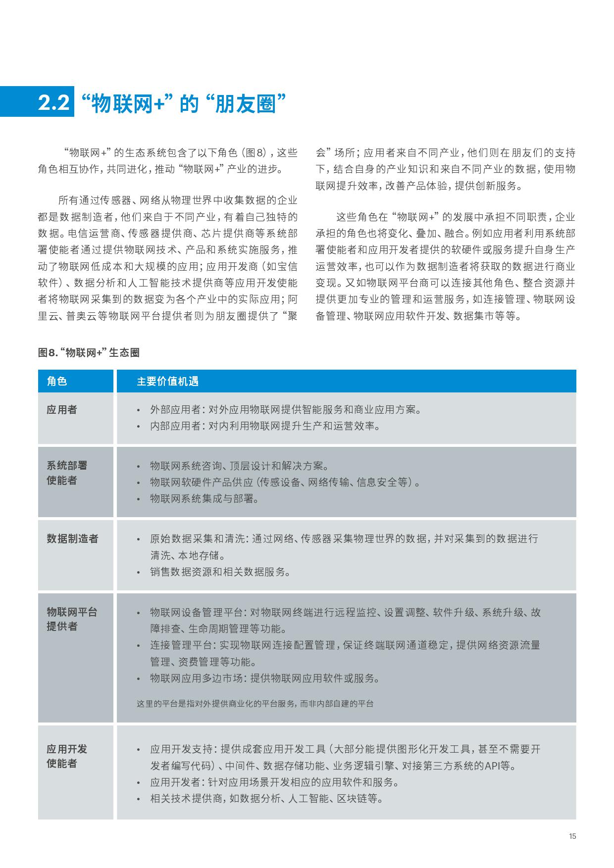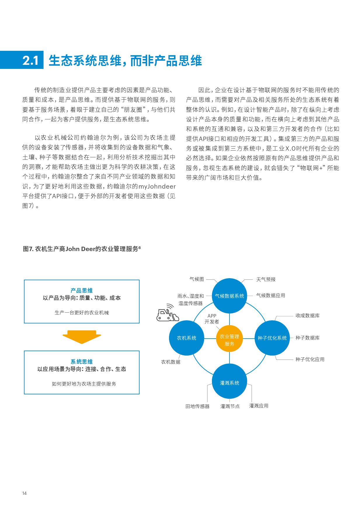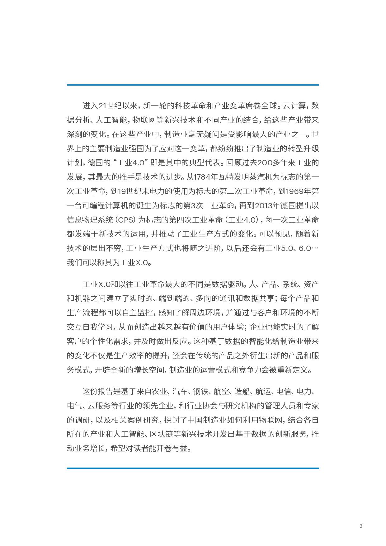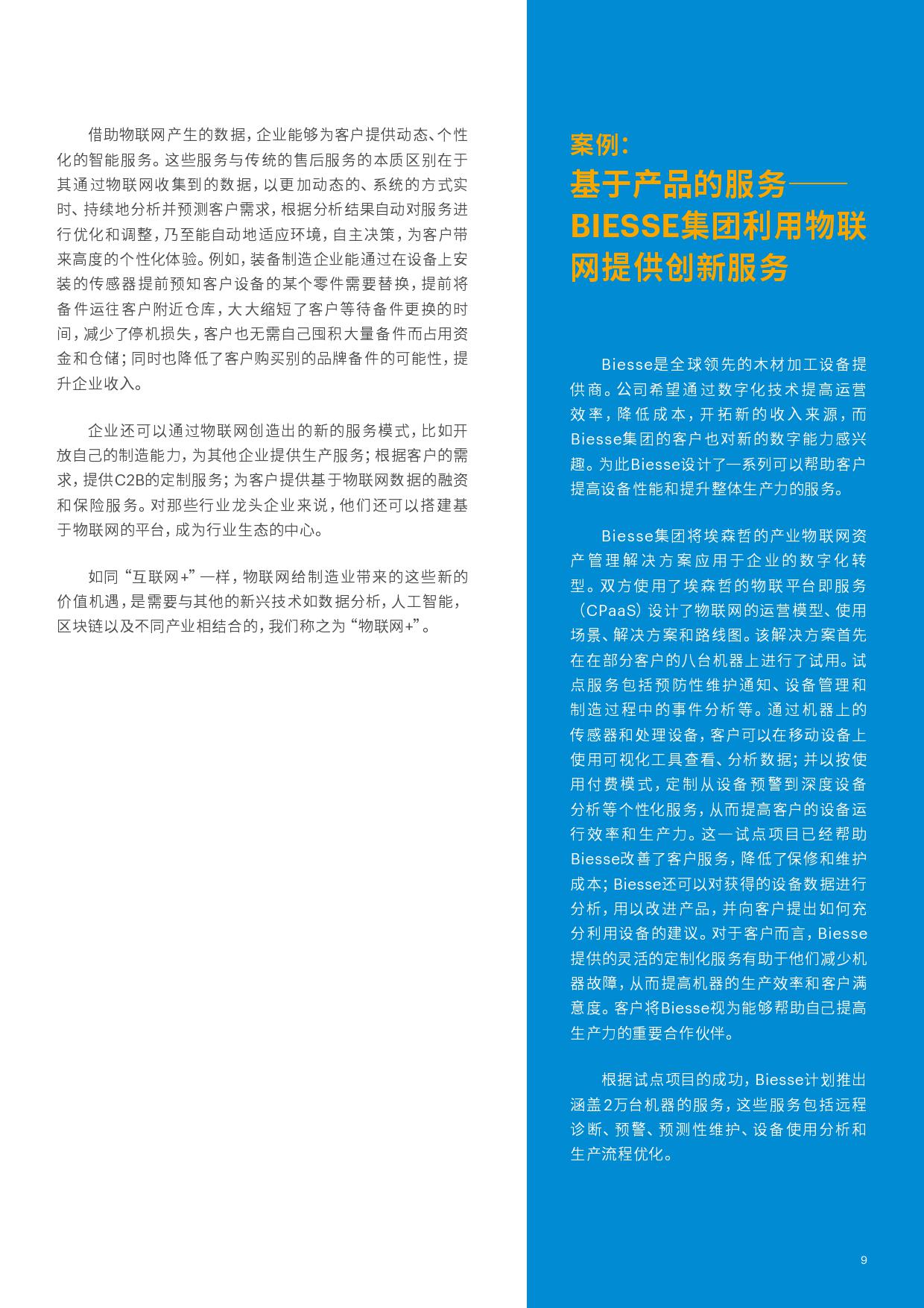 而物联网的发展则为企业向服务转型开辟了新的空间。 借助物联网产生的数据,企业能够为客户提供动态、个性化的智能服务。这些服务与传统的售后服务的本质区别在于其通过物联网收集到的数据,以更加动态的、系统的方式实时、持续地分析并预测客户需求,根据分析结果自动对服务进行优化和调整,乃至能自动地适应环境,自主决策,为客户带来高度的个性化体验。更为重要的是借助物联网,企业得以持续感知客户的需求,创造新的服务模式,推动业务增长,这才是物联网对企业最大的价值所在。如同“互联网+” 一样, 物联网给制造业带来的这些新的价值机遇, 是需要与其他的新兴技术如数据分析,人工智能,区块链以及不同产业相结合的,我们称之为”物联网+“ 。