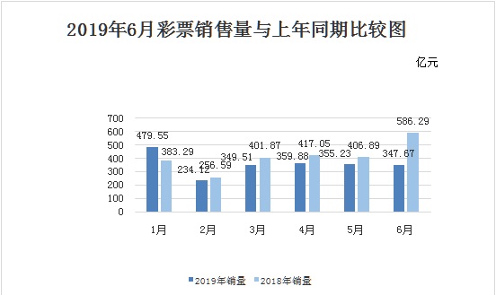 6月份,全国共销售彩票347.67亿元,比上年同期(简称“同比”)减少238.62亿元,下降40.7%,同比降幅较大主要原因是2018年6月世界杯足球赛竞猜型彩票游戏销量大,上年同期基数较高。其中,福利彩票机构销售159.18亿元,同比减少31.63亿元,下降16.6%。体育彩票机构销售188.49亿元,同比减少206.99亿元,下降52.3%。