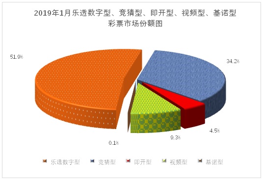 1月份,乐透数字型彩票销售248.87亿元,同比增加6.60亿元,增长2.7%;竞猜型彩票销售164.14亿元,同比增加82.39亿元,增长100.8%;即开型彩票销售21.85亿元,同比增加2.84亿元,增长15.0%;视频型彩票销售44.59亿元,同比增加4.44亿元,增长11.1%;基诺型彩票销售0.11亿元,同比减少0.02亿元,下降13.9%。1月份,乐透数字型、竞猜型、即开型、视频型、基诺型彩票销售量分别占彩票销售总量的51.9%、34.2%、4.5%、9.3%、0.1%。