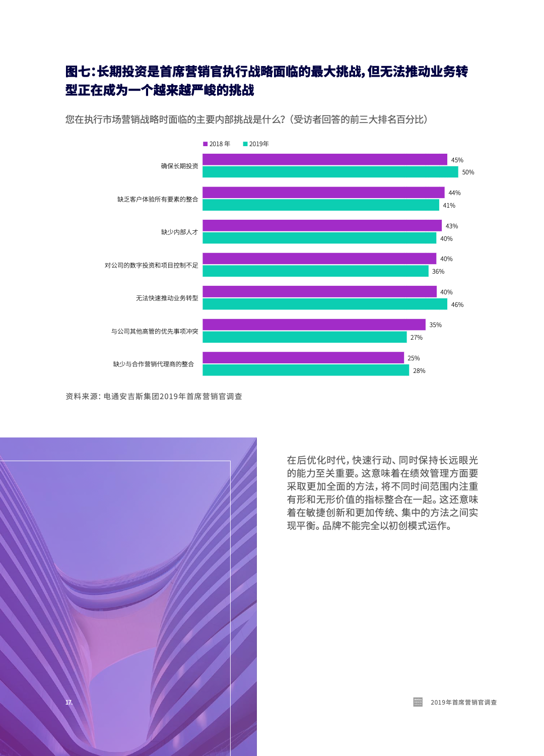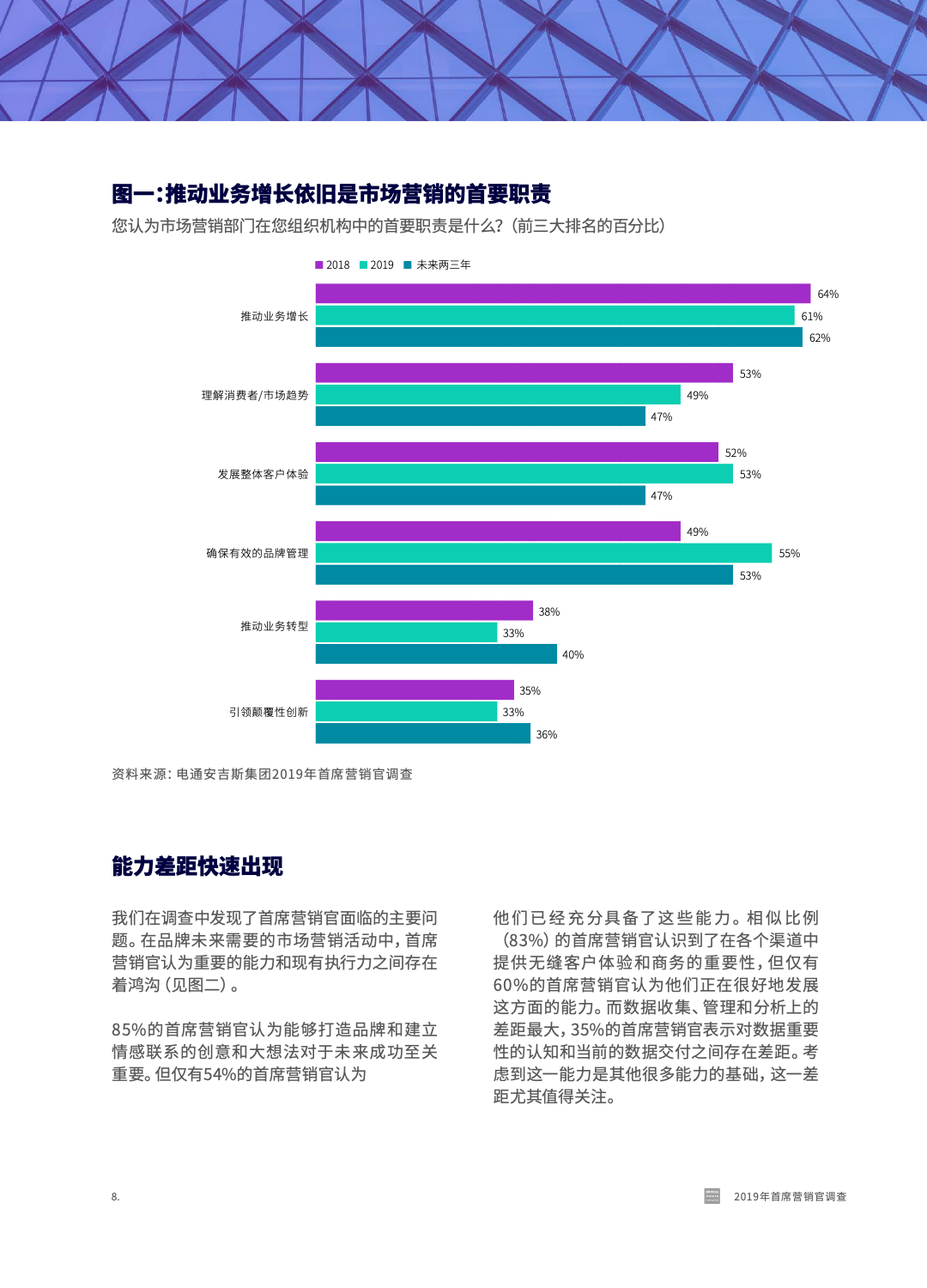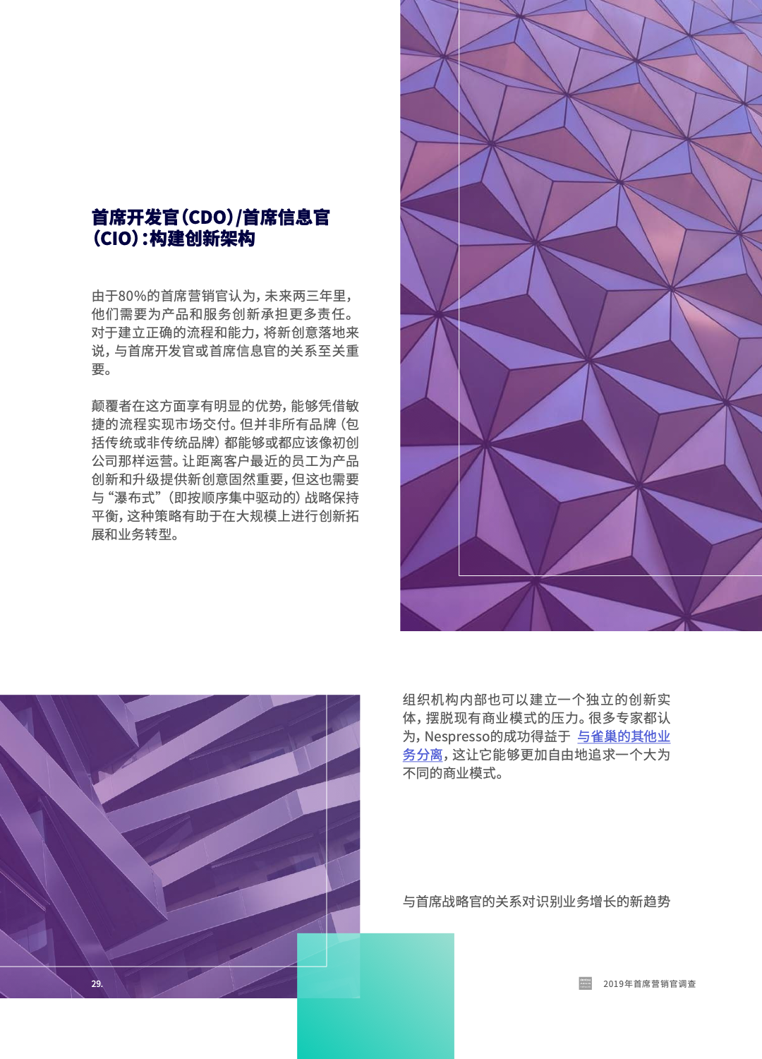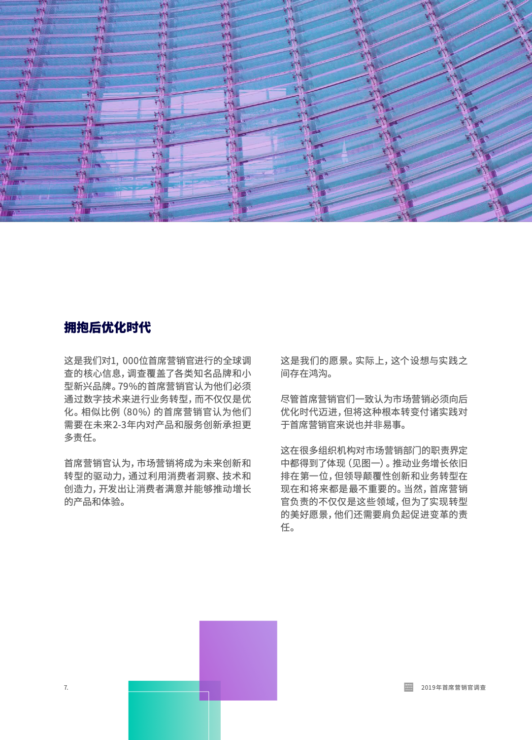 - 营销功能面临着落后于数字化竞争的风险,因为“转型和创新”仍然是当今营销职能中最不重要的角色之一,全球范围内的首席营销官们都在为实现短期指标而奔忙。