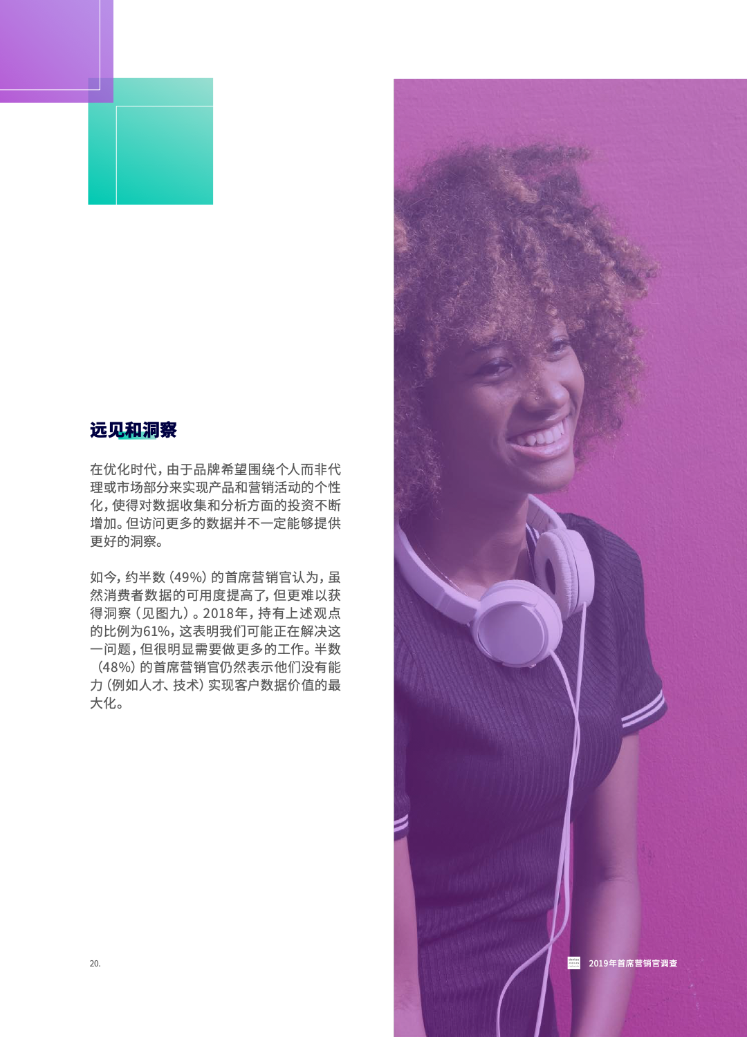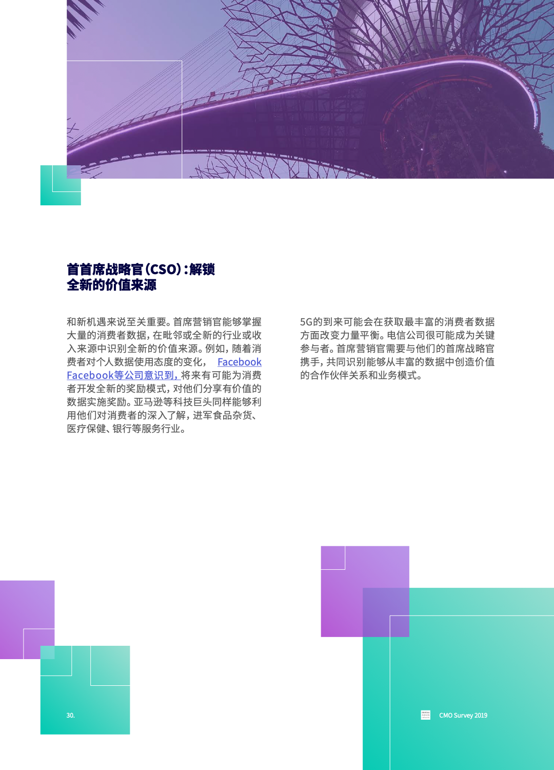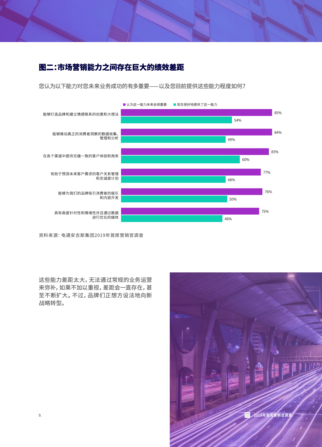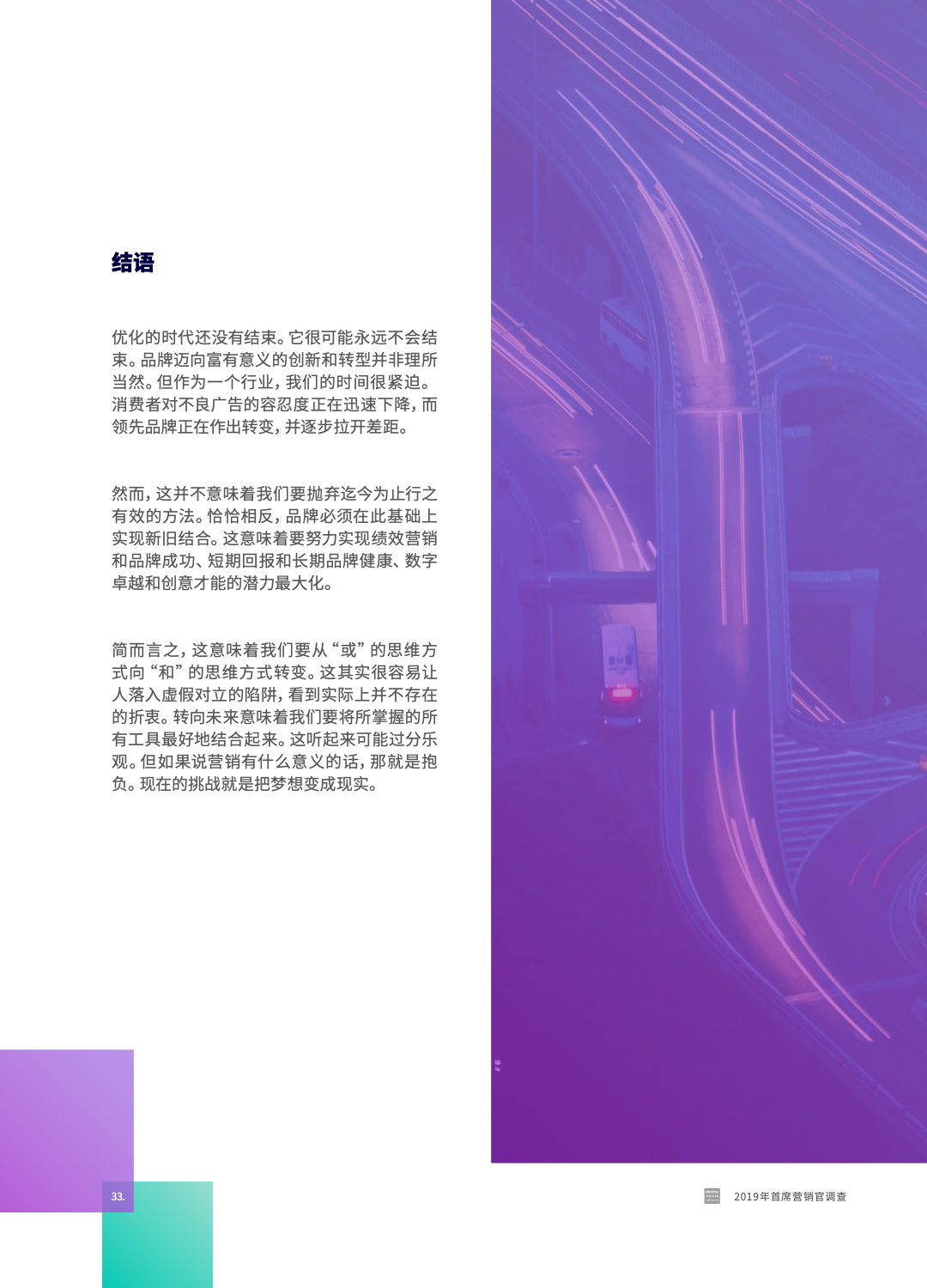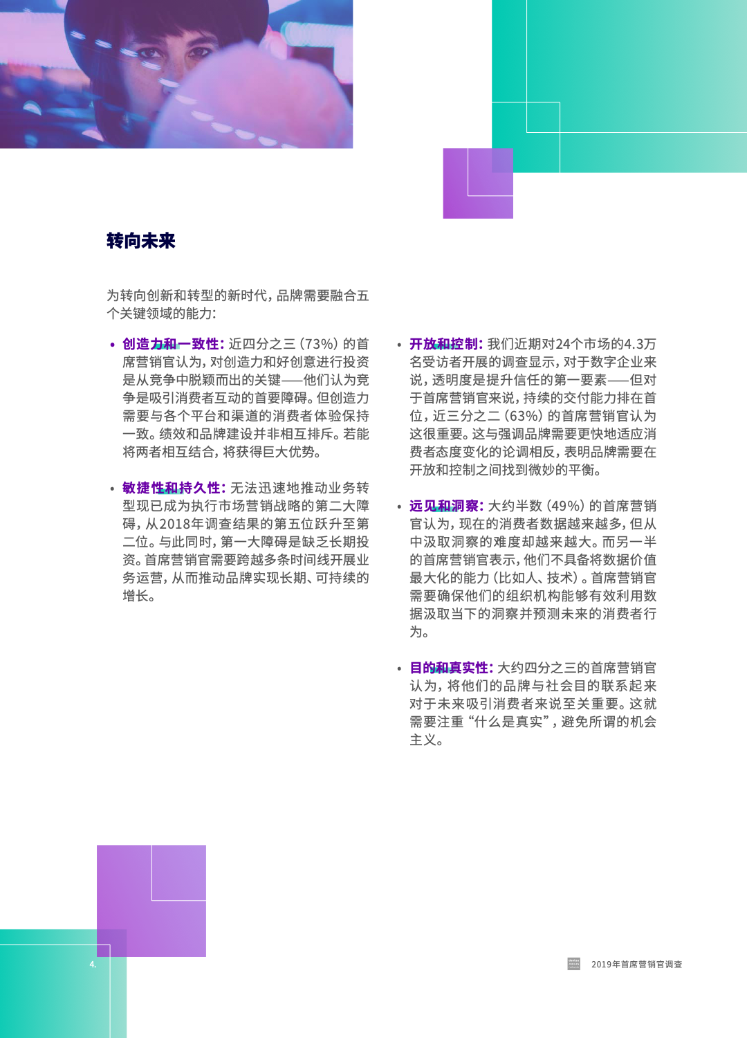 - 营销功能面临着落后于数字化竞争的风险,因为“转型和创新”仍然是当今营销职能中最不重要的角色之一,全球范围内的首席营销官们都在为实现短期指标而奔忙。