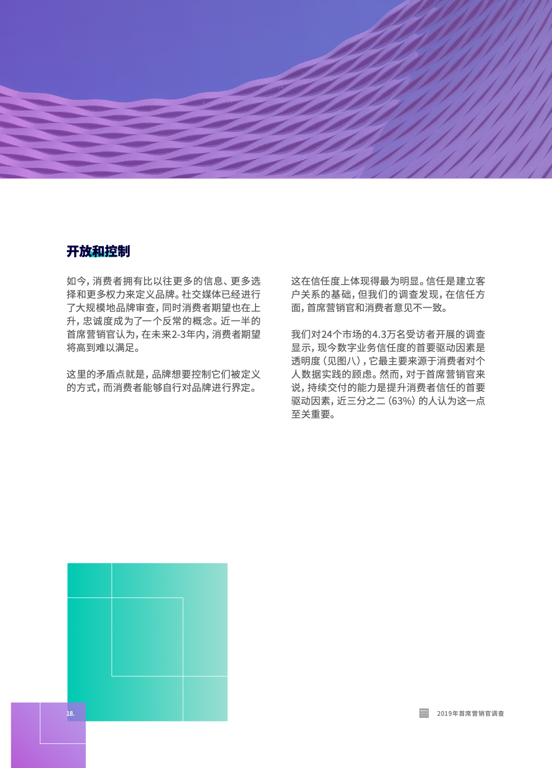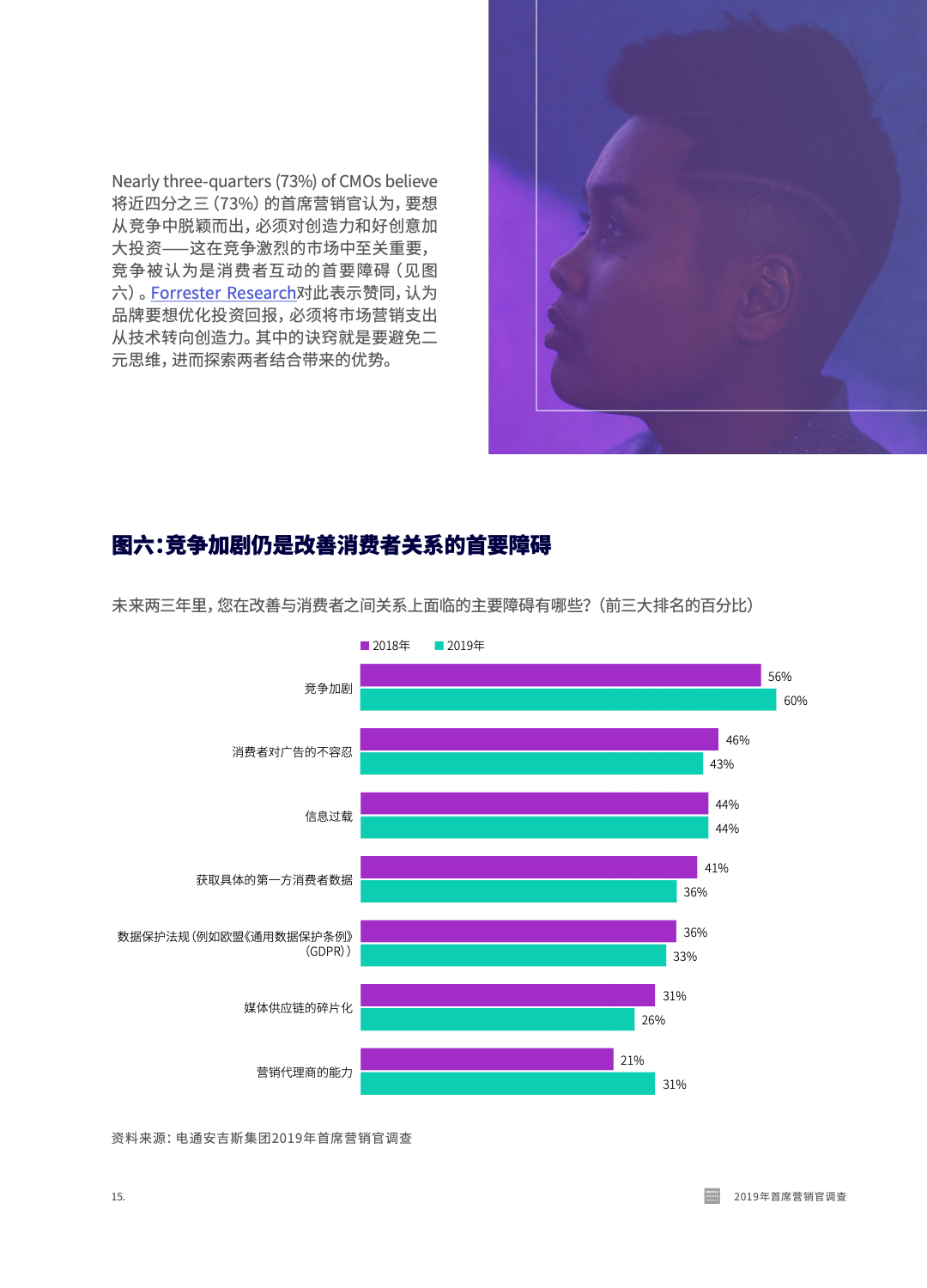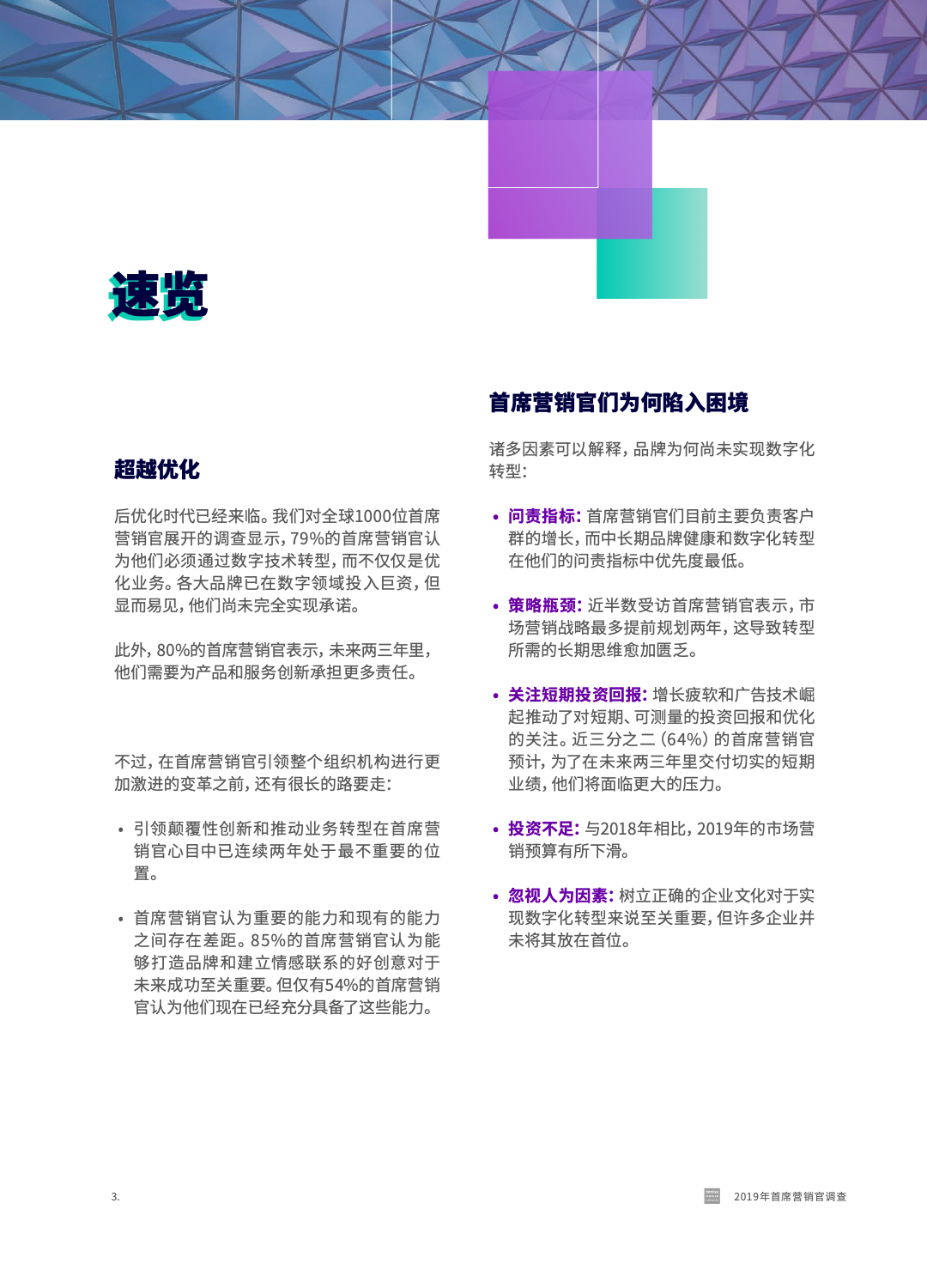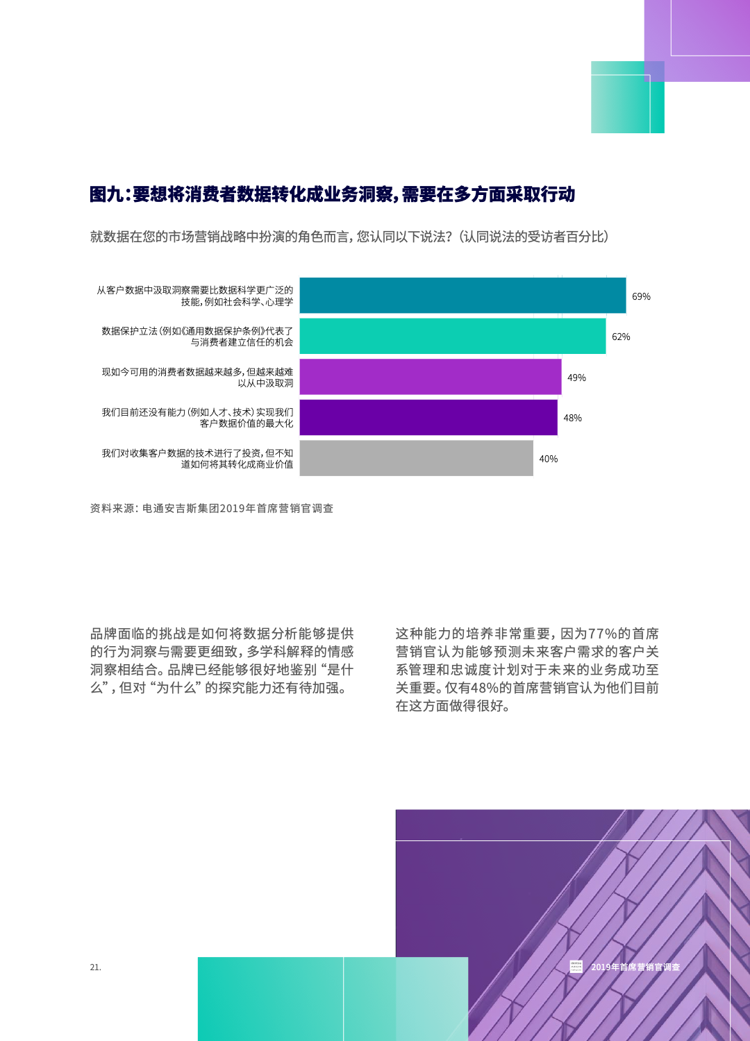 - 营销功能面临着落后于数字化竞争的风险,因为“转型和创新”仍然是当今营销职能中最不重要的角色之一,全球范围内的首席营销官们都在为实现短期指标而奔忙。