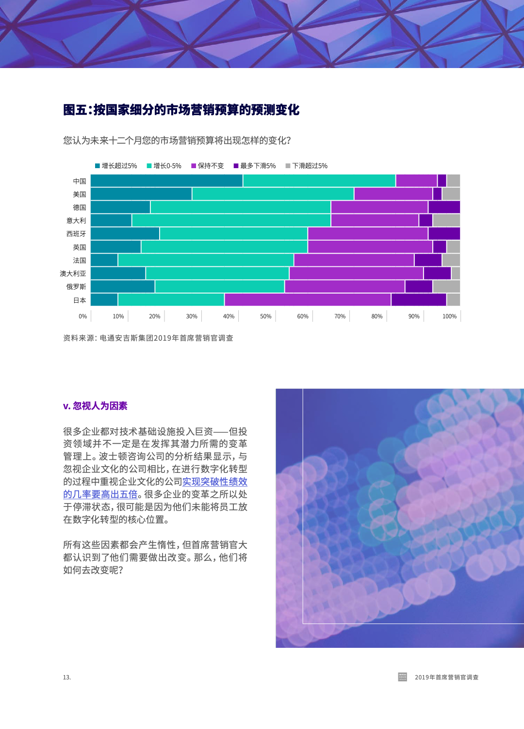 在全球范围内,无法锁定长期投资被认为是实现营销战略的最大障碍(50%的首席营销官将其列为三大担忧之一)。在全球范围内,未来12个月的前景好坏参半,尽管营收在增长(64%的受访者报告同期收入增长),但41%的首席营销官报告其营销预算持平或下降。中国是一个罕见的例外,只有17%的首席营销官报告预算持平或下降(相比之下,87%的受访者报告其业务收入增长)。