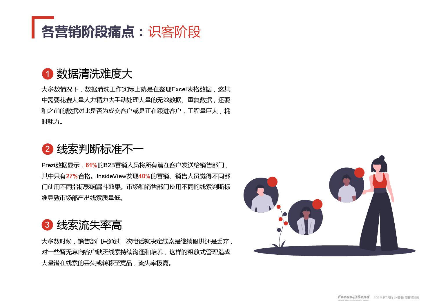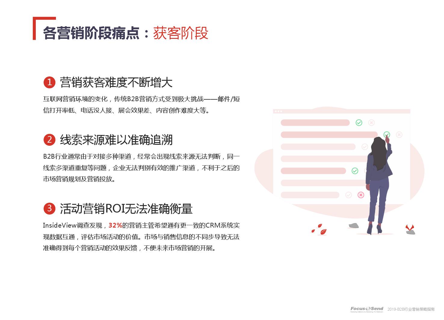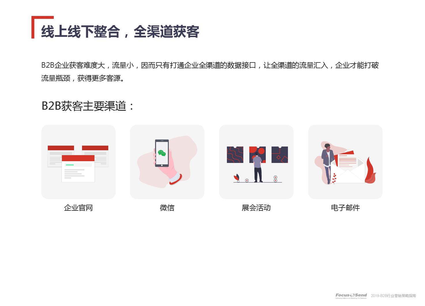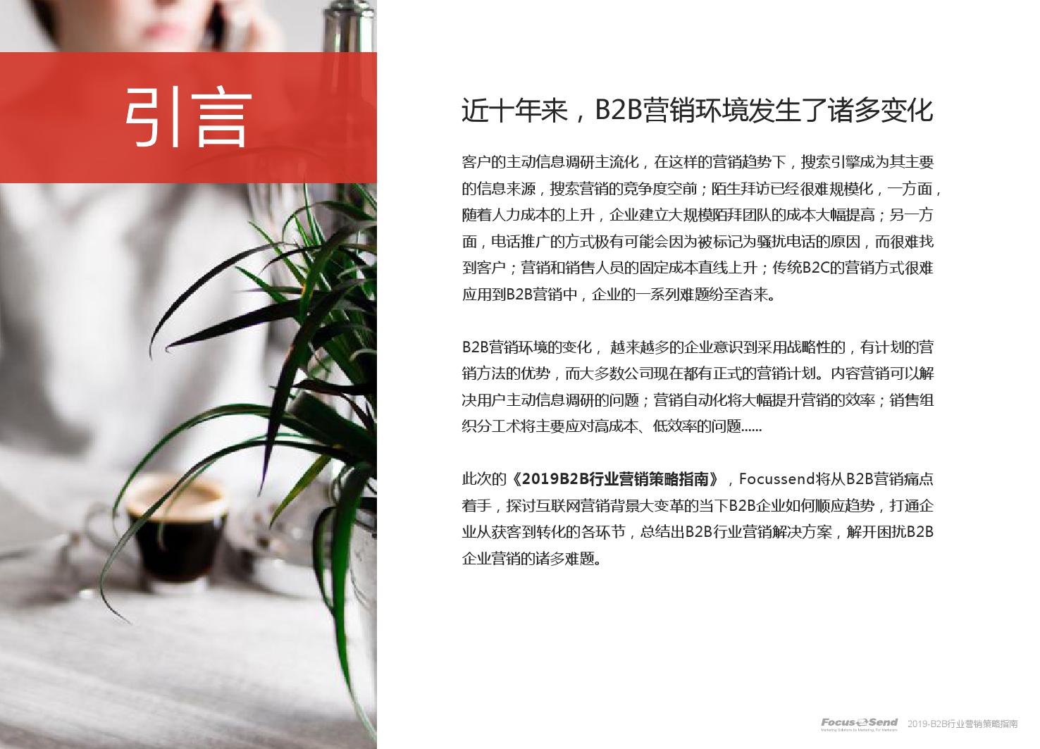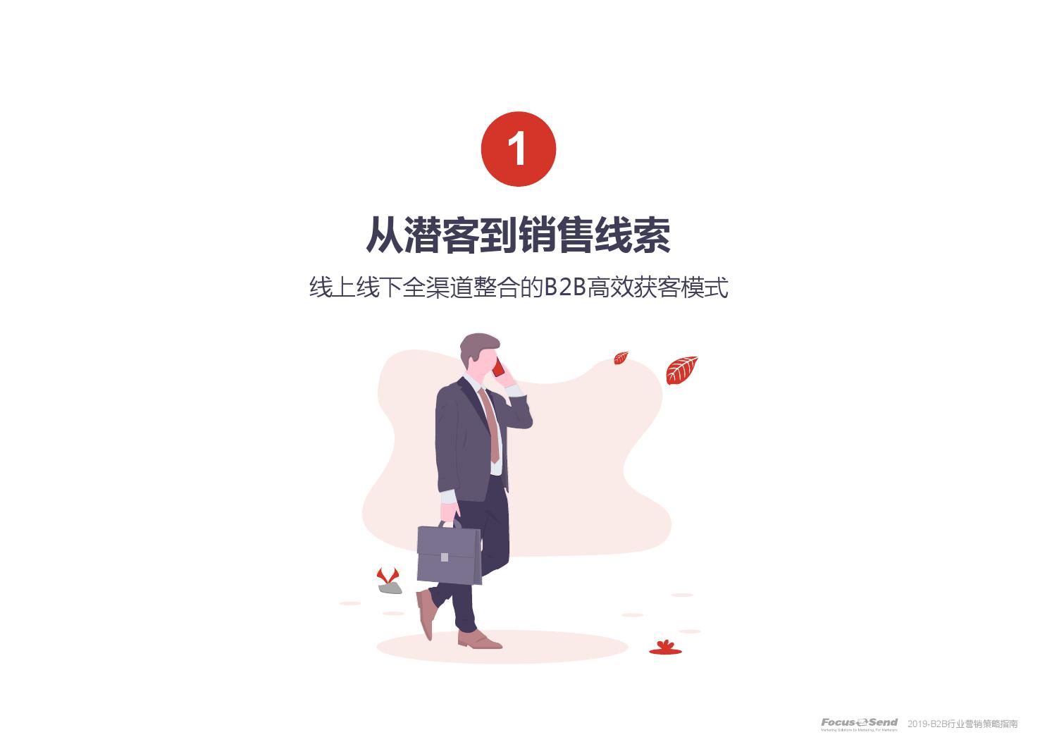 客户的主动信息调研主流化,在这样的营销趋势下,搜索引擎成为其主要 的信息来源,搜索营销的竞争度空前;陌生拜访已经很难规模化,一方面, 随着人力成本的上升,企业建立大规模陌拜团队的成本大幅提高;另一方 面,电话推广的方式极有可能会因为被标记为骚扰电话的原因,而很难找 到客户;营销和销售人员的固定成本直线上升;传统B2C的营销方式很难 应用到B2B营销中,企业的一系列难题纷至沓来。
