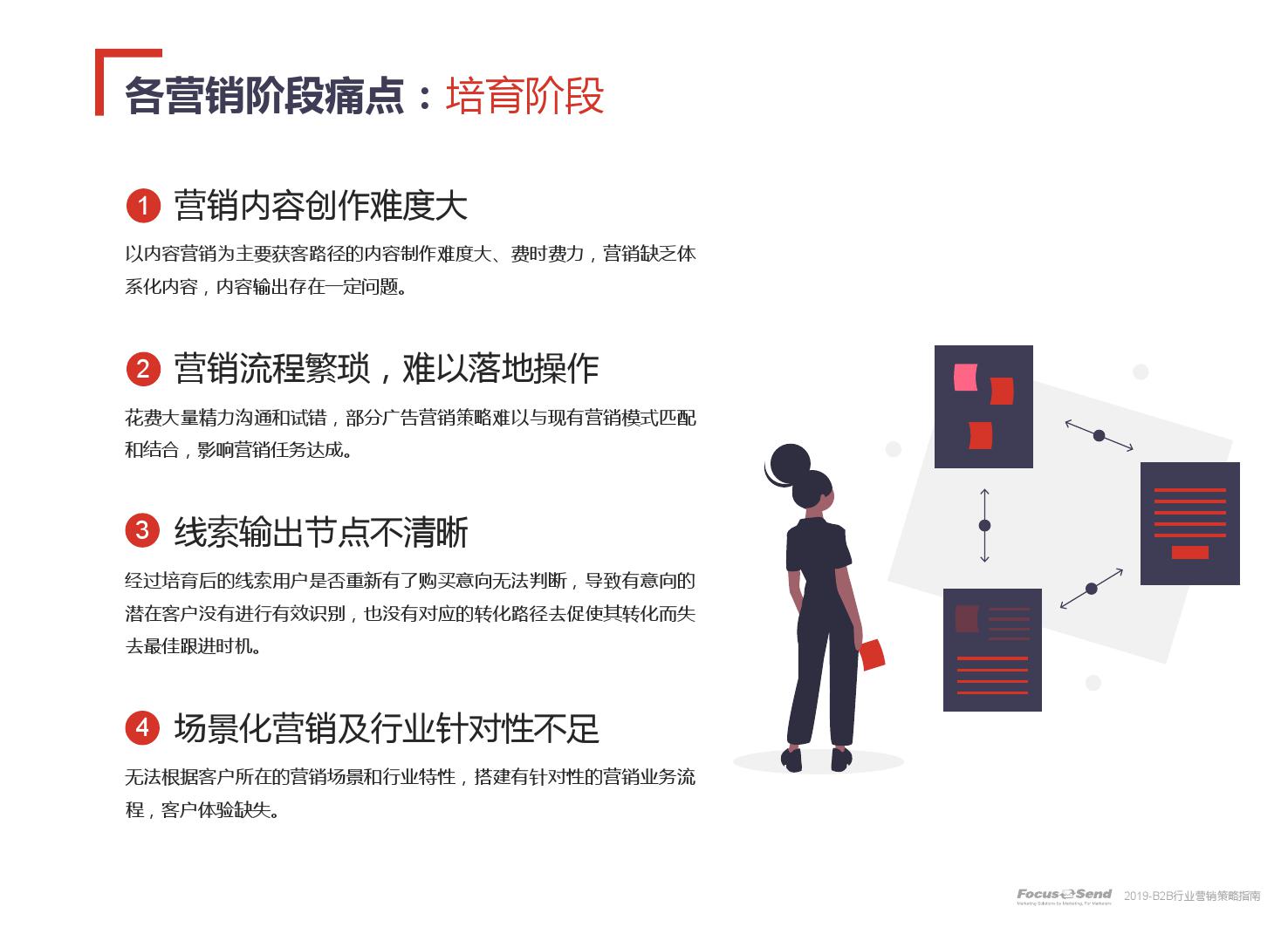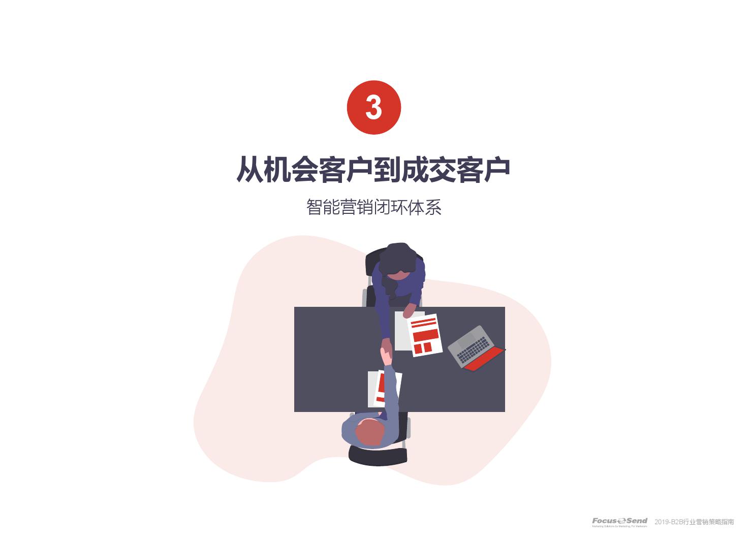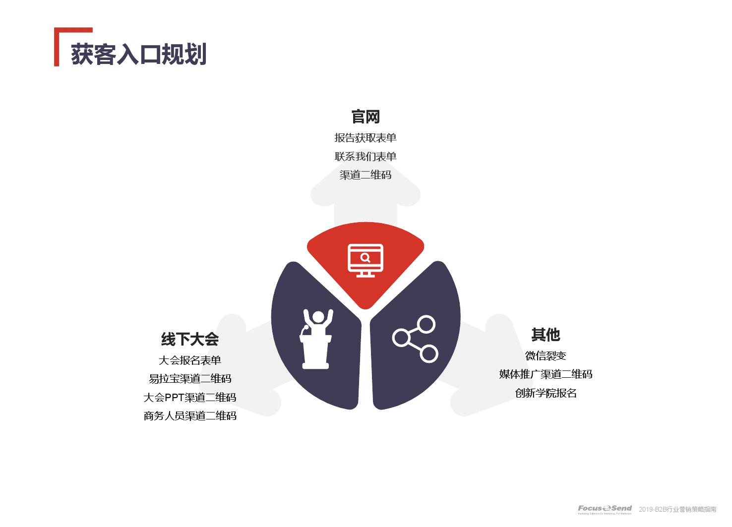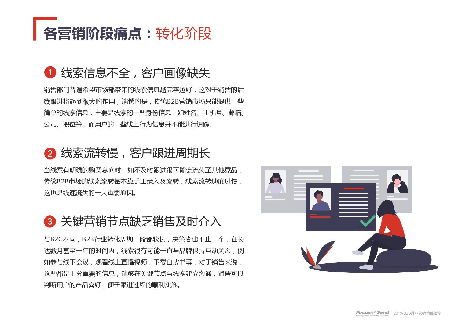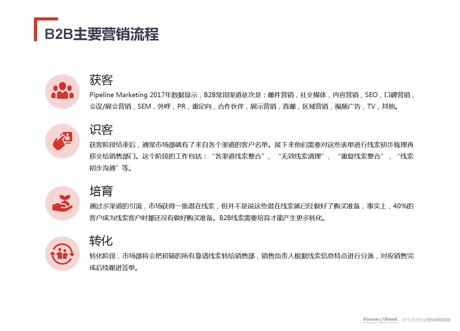 客户的主动信息调研主流化,在这样的营销趋势下,搜索引擎成为其主要 的信息来源,搜索营销的竞争度空前;陌生拜访已经很难规模化,一方面, 随着人力成本的上升,企业建立大规模陌拜团队的成本大幅提高;另一方 面,电话推广的方式极有可能会因为被标记为骚扰电话的原因,而很难找 到客户;营销和销售人员的固定成本直线上升;传统B2C的营销方式很难 应用到B2B营销中,企业的一系列难题纷至沓来。
