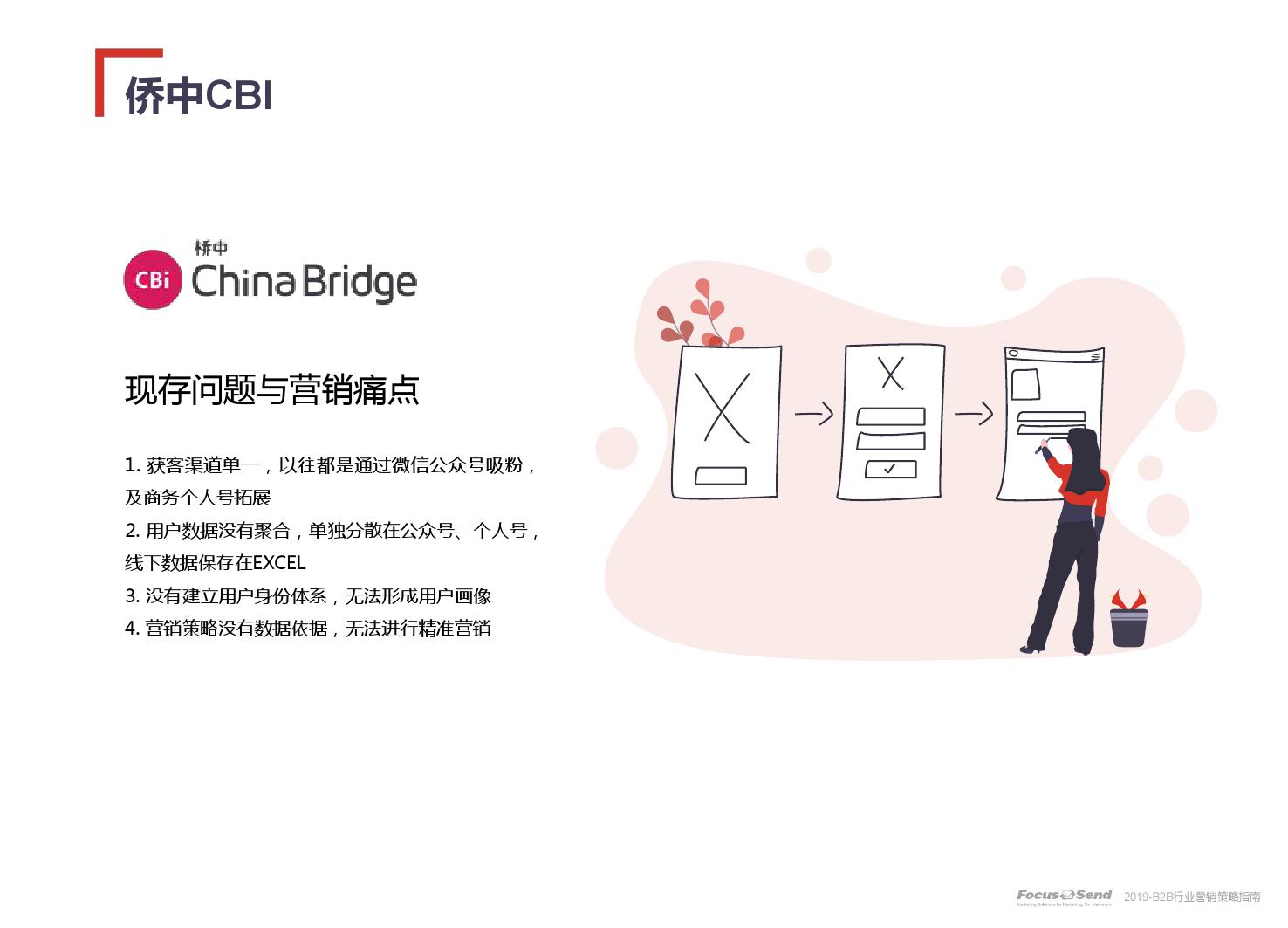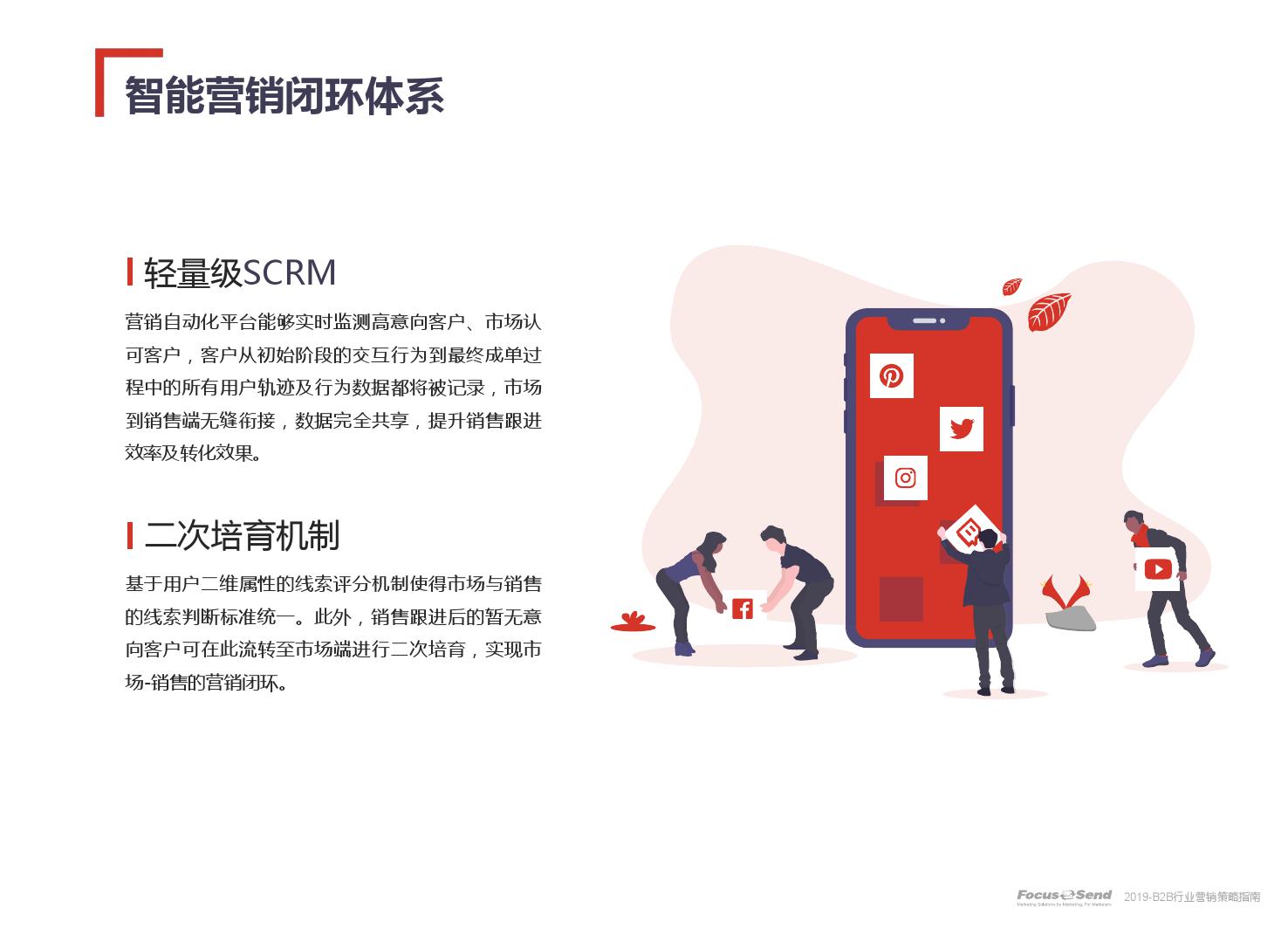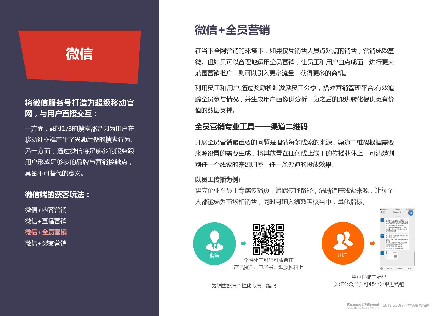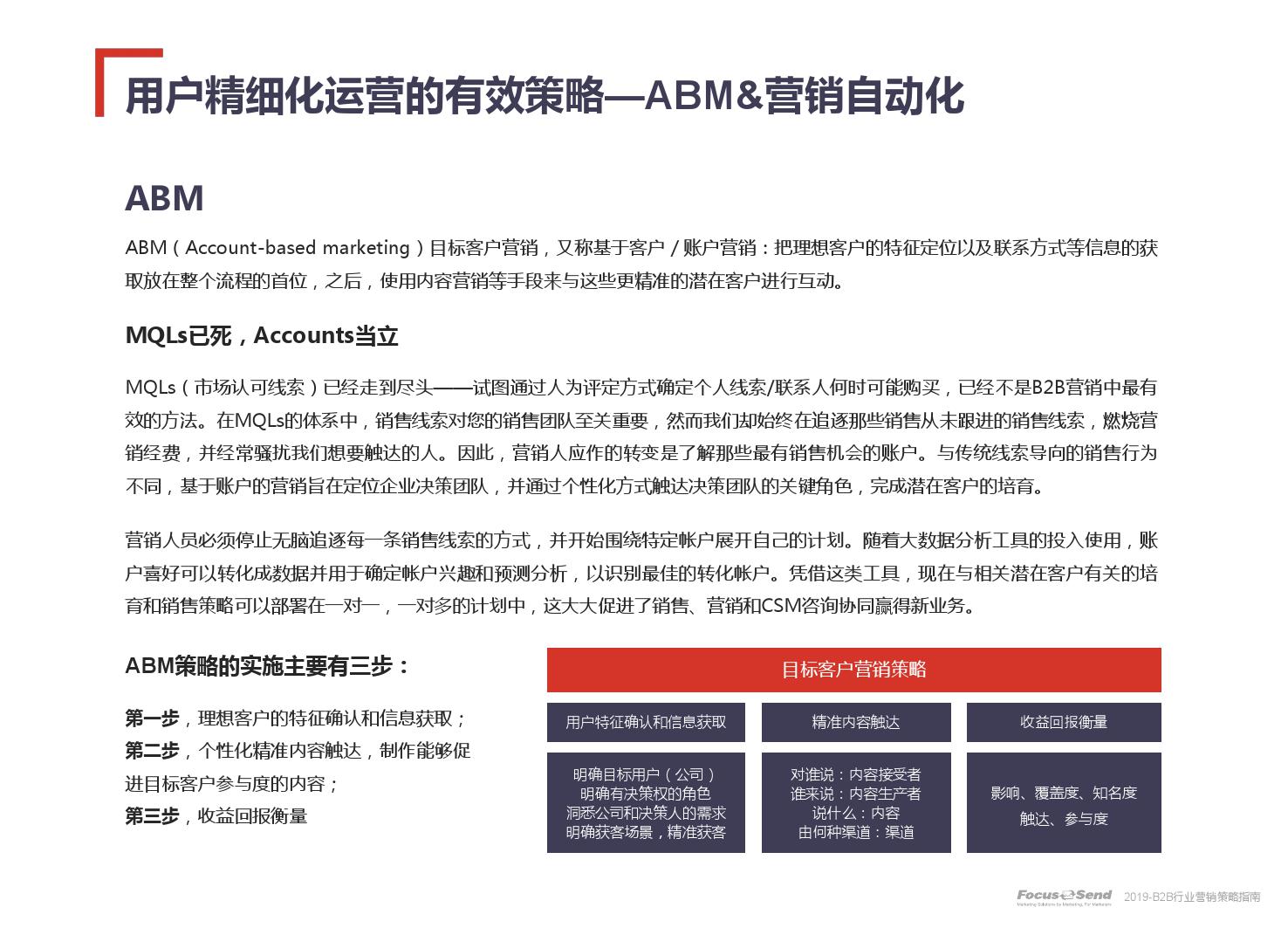 客户的主动信息调研主流化,在这样的营销趋势下,搜索引擎成为其主要 的信息来源,搜索营销的竞争度空前;陌生拜访已经很难规模化,一方面, 随着人力成本的上升,企业建立大规模陌拜团队的成本大幅提高;另一方 面,电话推广的方式极有可能会因为被标记为骚扰电话的原因,而很难找 到客户;营销和销售人员的固定成本直线上升;传统B2C的营销方式很难 应用到B2B营销中,企业的一系列难题纷至沓来。