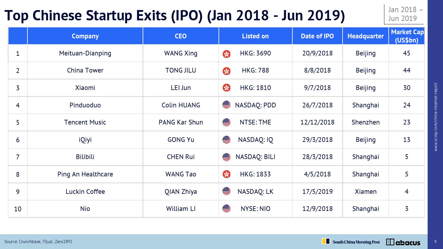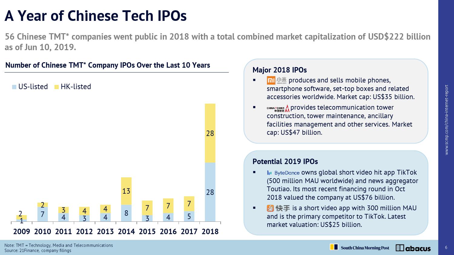 2018 年中国主要有两起 IPO 事件:小米和中国铁塔。前者在全球范围内生产和销售手机、智能手机软件、机顶盒和相关配件,市值为 350 亿美元;后者提供电信塔建设、塔楼维护、配套设施管理等服务,市值为 470 亿美元。