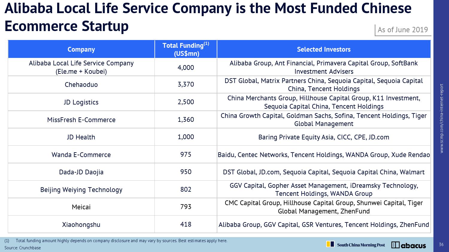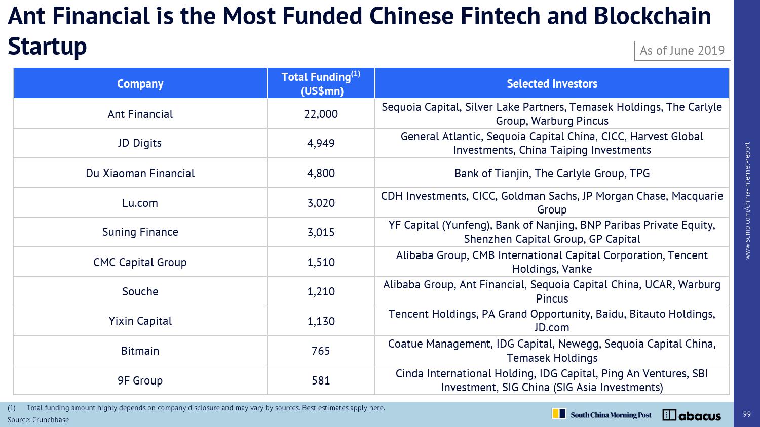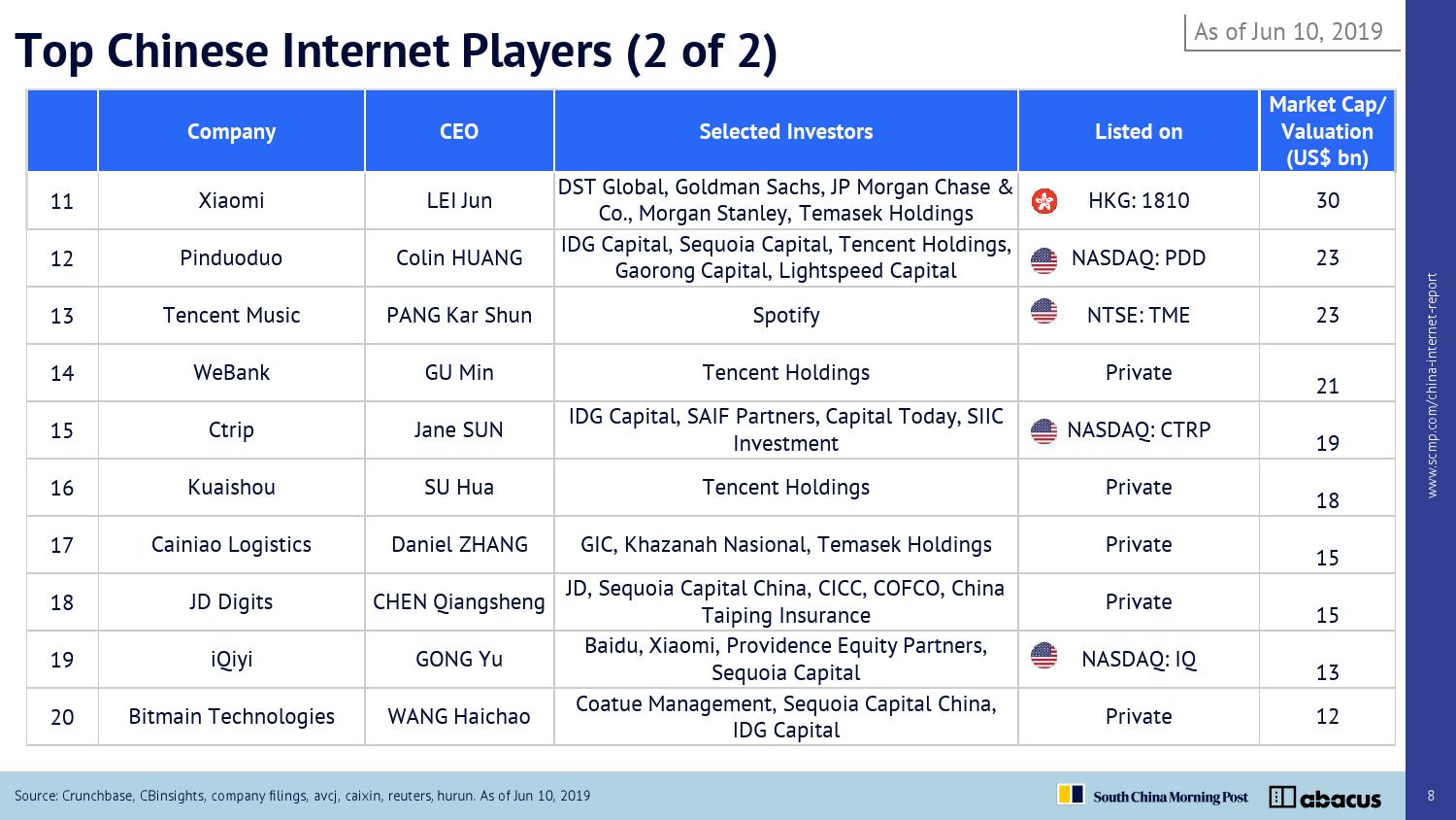 根据报告统计,中国最大的五家互联网企业分别为腾讯、阿里巴巴、蚂蚁金服、今日头条和滴滴出行,估值分别为 4180 亿美元、4160 亿美元、1500 亿美元、750 亿美元和 560 亿美元。