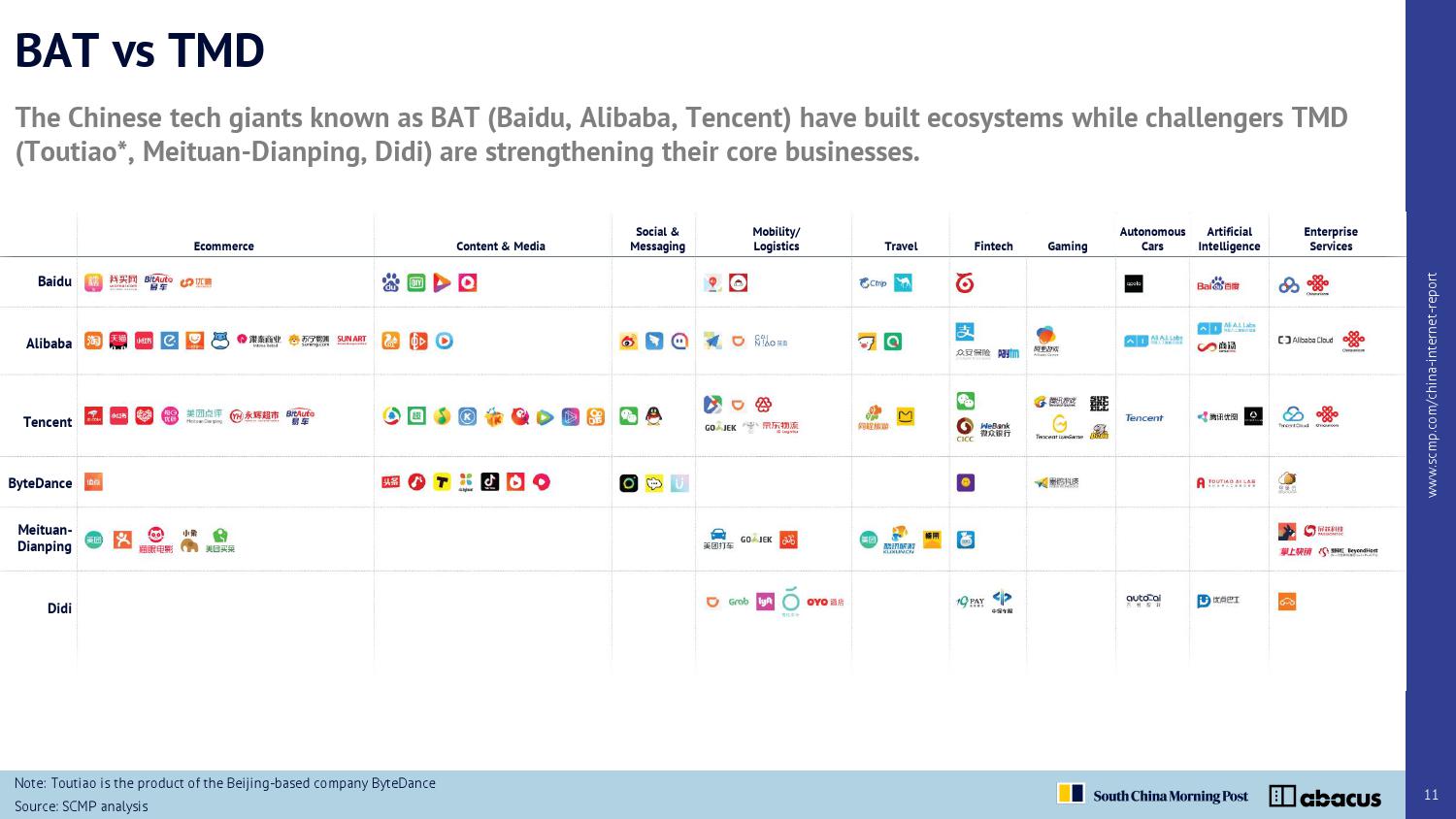 经过 2019 年一年的发展,过去以三大互联网巨头 BAT(百度、阿里巴巴、腾讯)为首的生态系统也遭遇了新的挑战,后起之秀 TMD(今日头条、美团点评、滴滴出行)正在以破竹之势来不断“撼动”前者的地位。