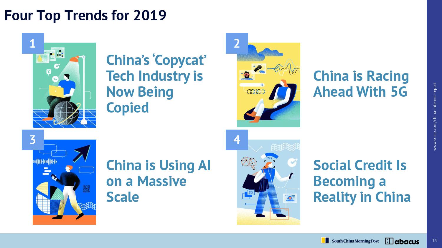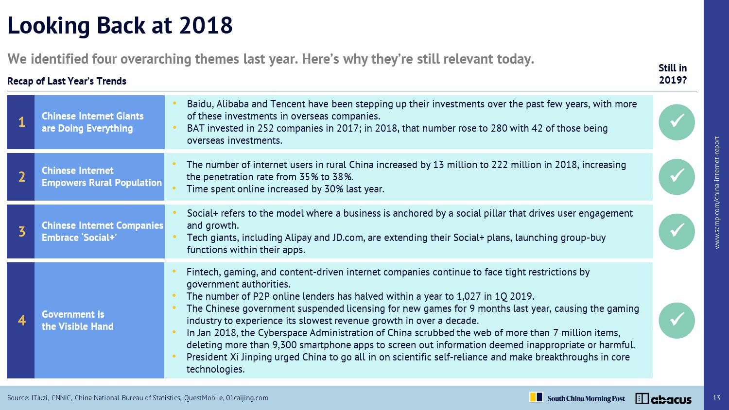 在2018年的报告中曾提到过中国互联网的一些发展趋势,譬如中国互联网巨头无所不做、中国互联网企业拥抱“Social+”战略、政府仍然是管控互联网的无形之手……等等,而今年这些趋势仍在继续。