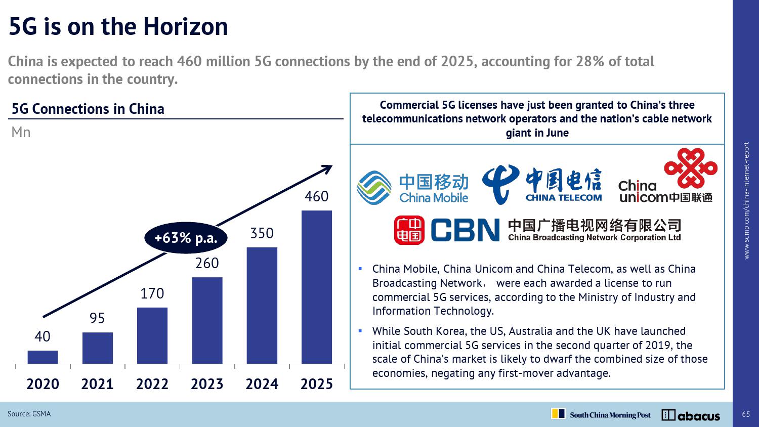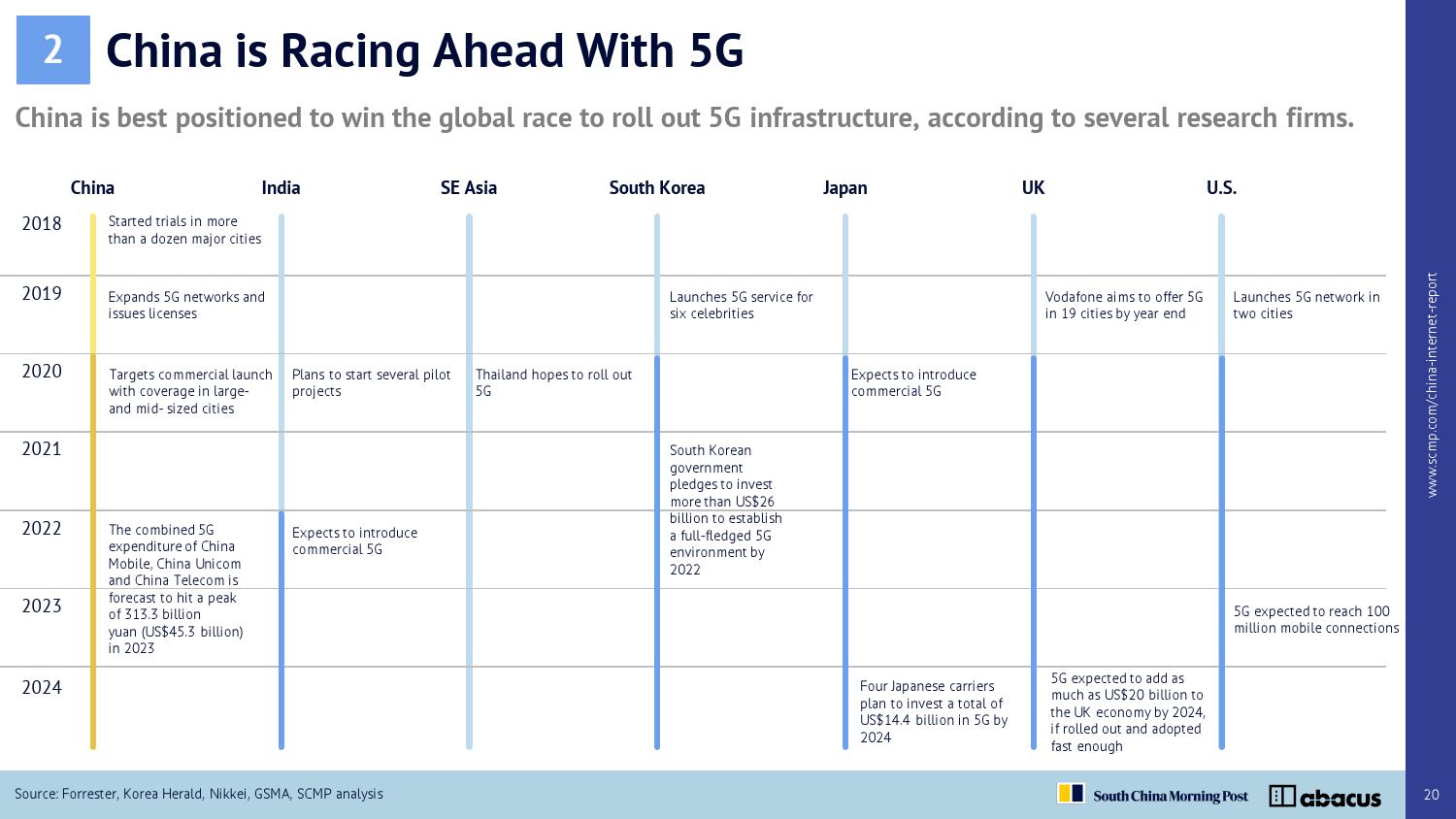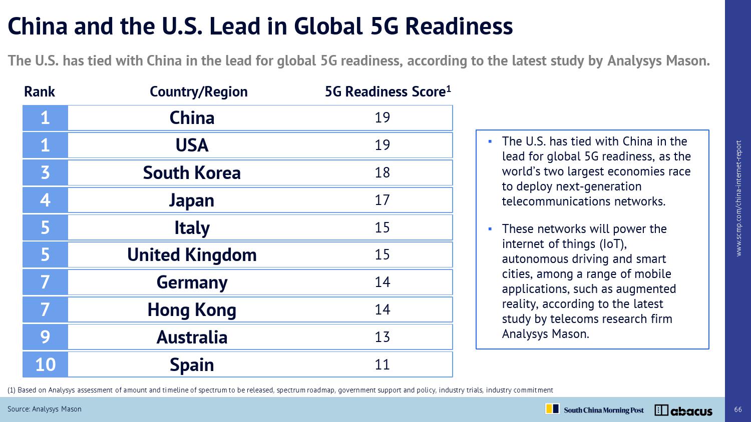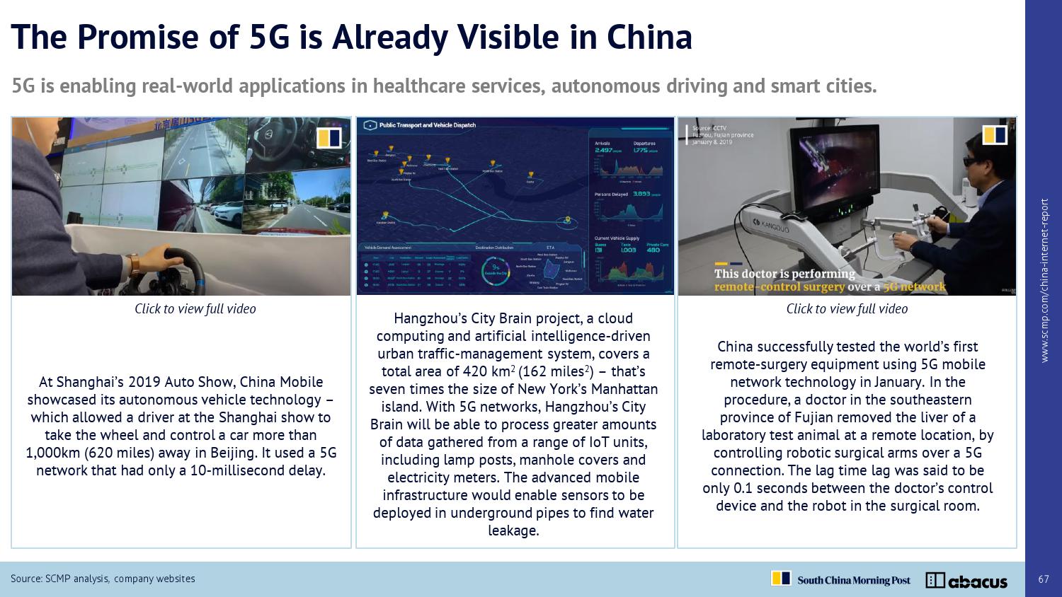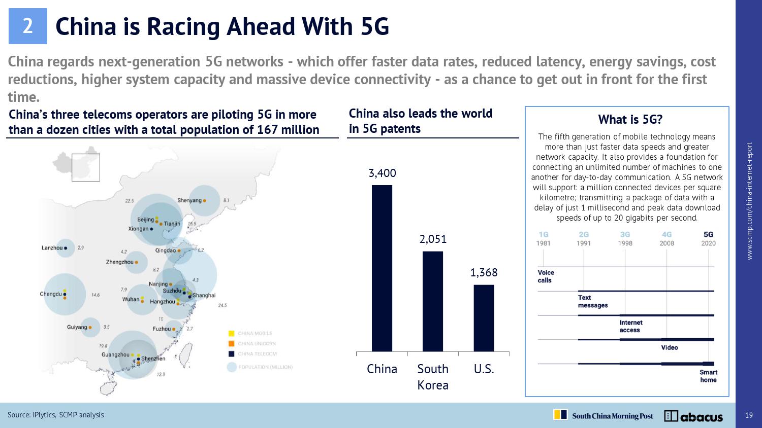 5G 不仅意味着更快的数据速度和更大的网络容量,还为无限数量的机器提供了日常通信的基础。中国被认定为下一代 5G 网络的引领者,能够提供更快的数据速率、更短的延迟、更低的能耗、更低的成本、更高的系统容量和大规模的设备连接。据报道,中国目前拥有最多的 5G 专利,并在十几个城市开展了 5G 试点项目,覆盖人口达 1.67 亿。