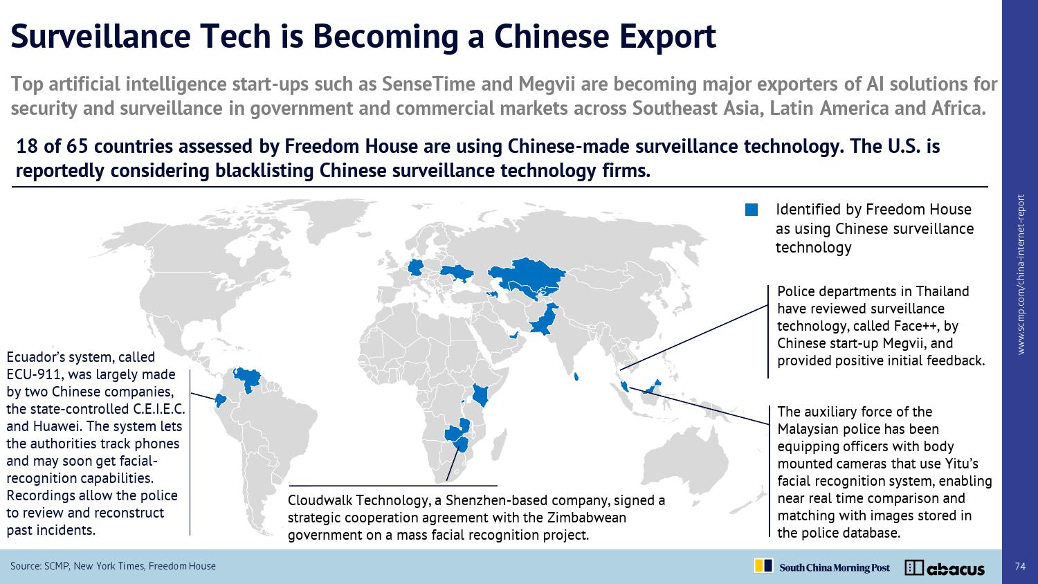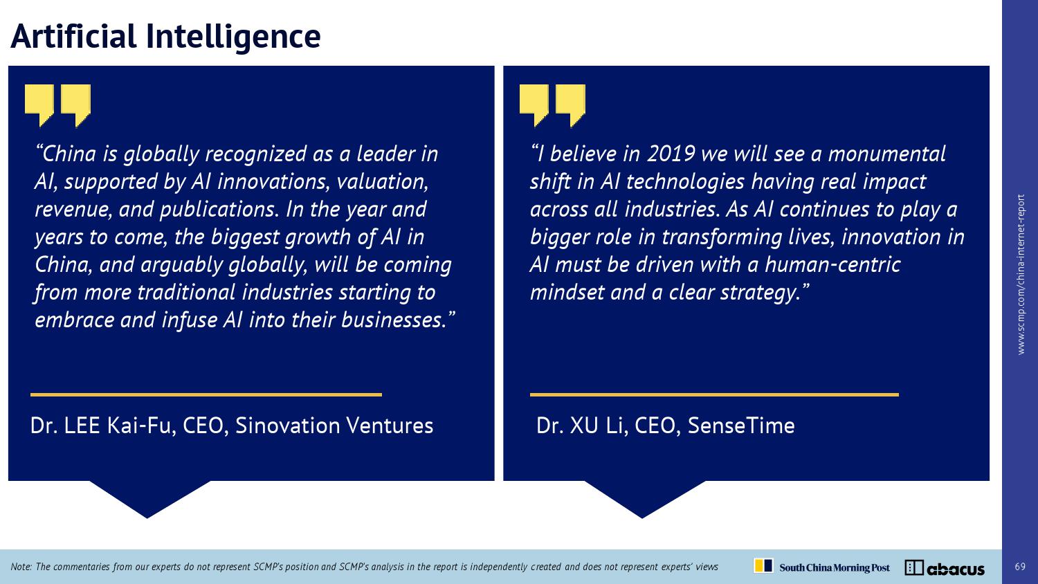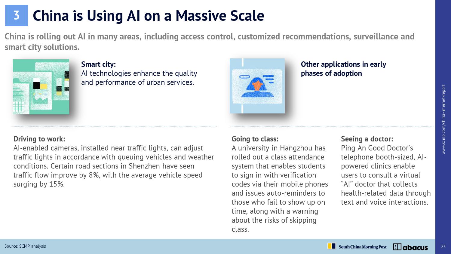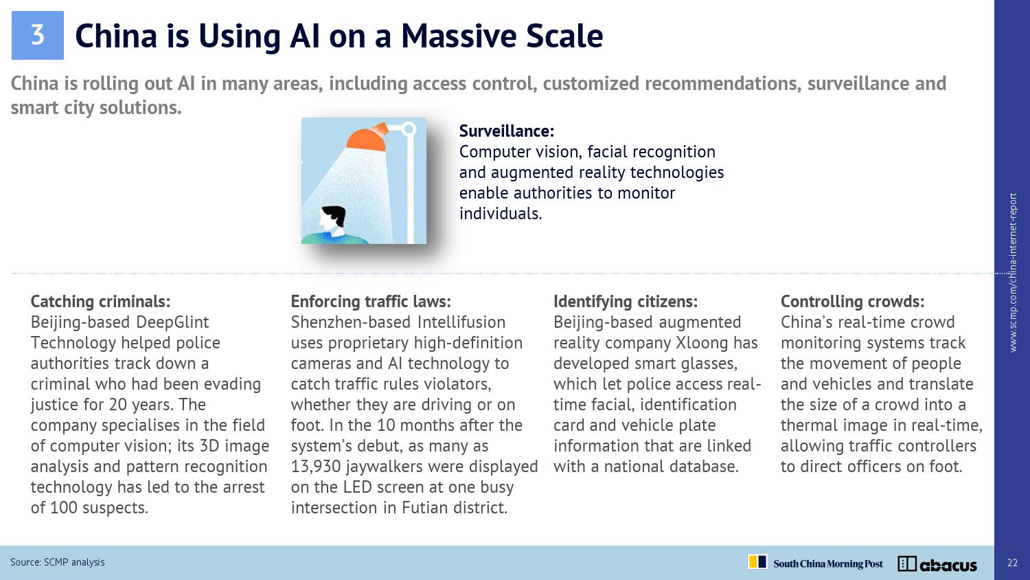 报告发现,人工智能(AI)也在中国大规模使用,其应用范围包括地铁支付票价、面部识别进入酒店、以及在线购物或在线浏览新闻的定制推荐等。此外,人工智能也被广泛用于监控监视,如帮助追踪逃犯或执行交通法。