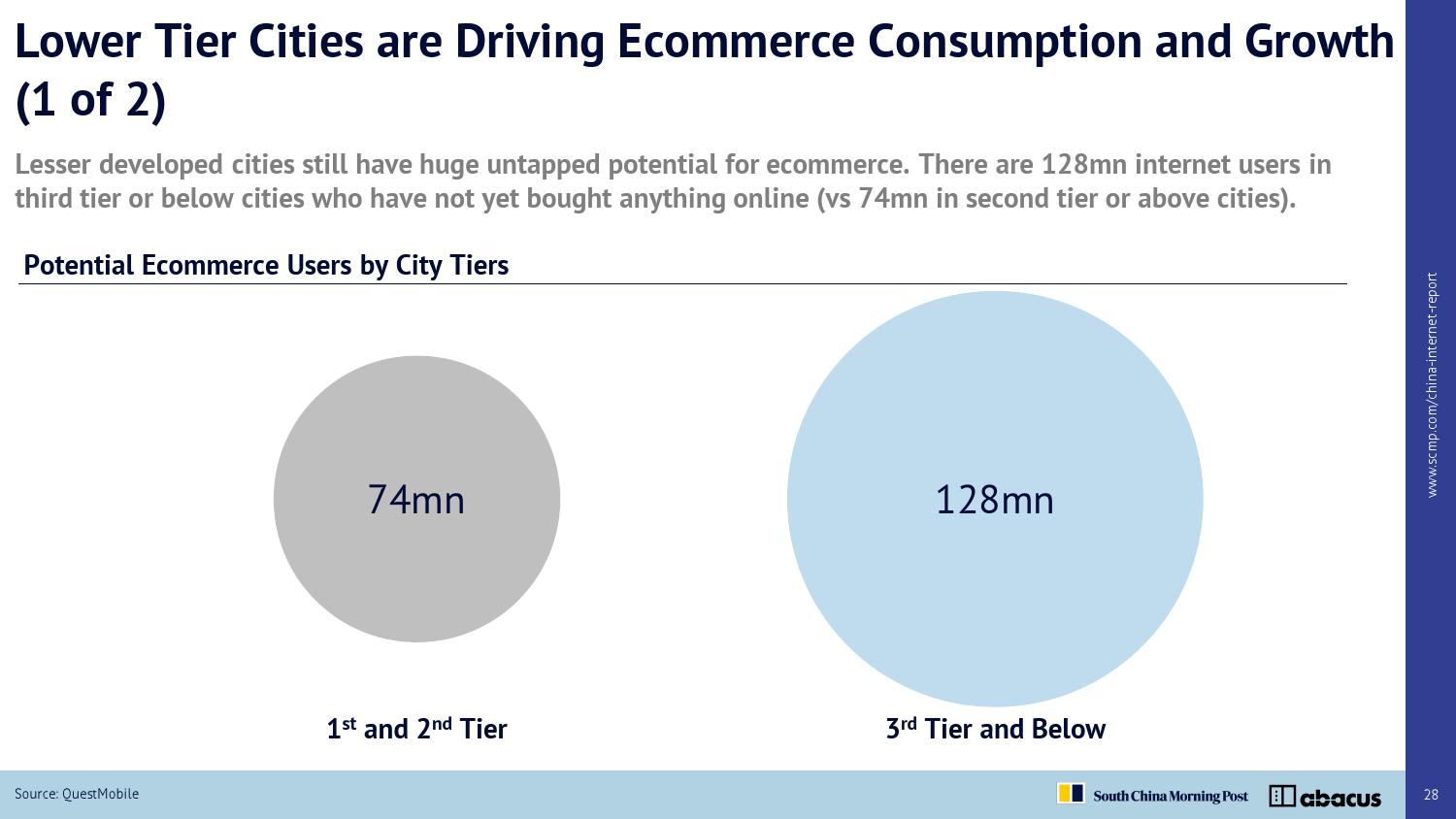 中国的很多欠发达地区仍有巨大的电子商务开发潜力。根据该报告,在三线或以下城市有 1.28 亿互联网用户尚未在线购买任何东西,而二线或以上城市则为 7400 万。