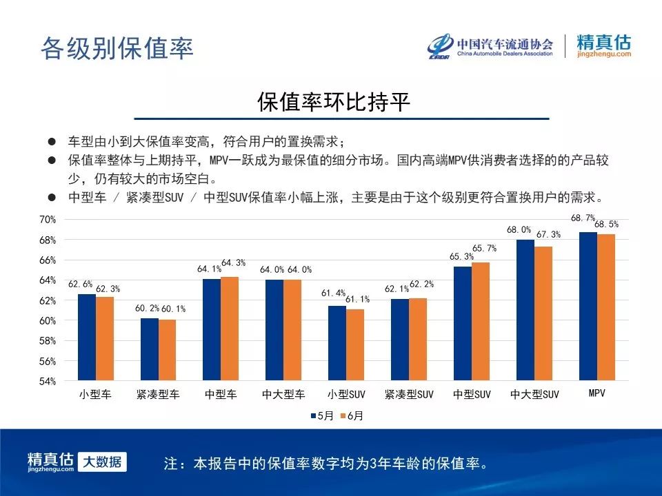 本月保值率与上月基本持平,细分市场当中,MPV一跃成为最保值的车型。这主要是由于MPV可供消费者选择的车型还是偏少,厂商竞争并不激烈,仍有很大的市场空白。保值率环比总体与上月持平,各级别有升有降,其中上涨的都是一些尺寸较大的。置换用户通常会选择这些车。