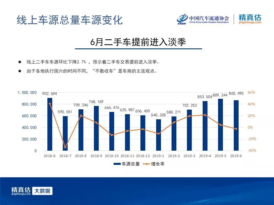从线上车源来看,上个月车源量几乎已经停止增长,本月出现了小幅下降。通常七八月是二手车淡季,从数据上看,今年六月就提前进入淡季了。这个现象也与国六有或多或少的关联。由于各地执行“国六”的时间不同,要么担心不能上牌,要么担心价格暴涨暴跌,“不敢收车”是车商的主流经营状态。