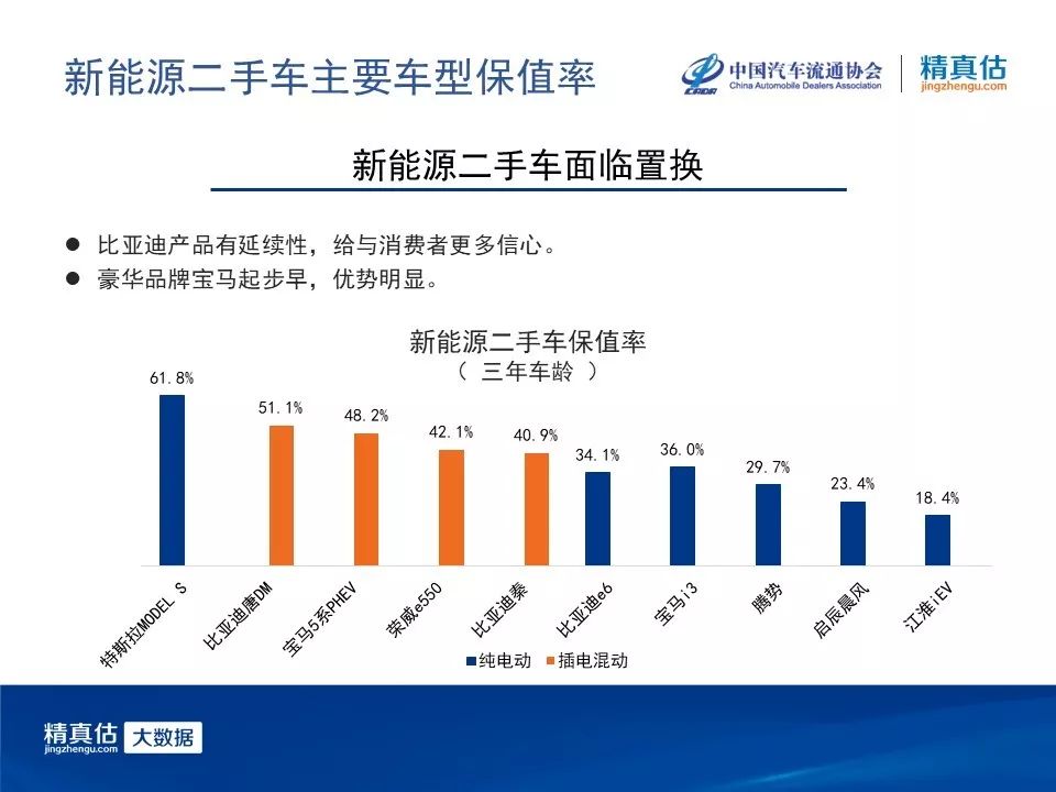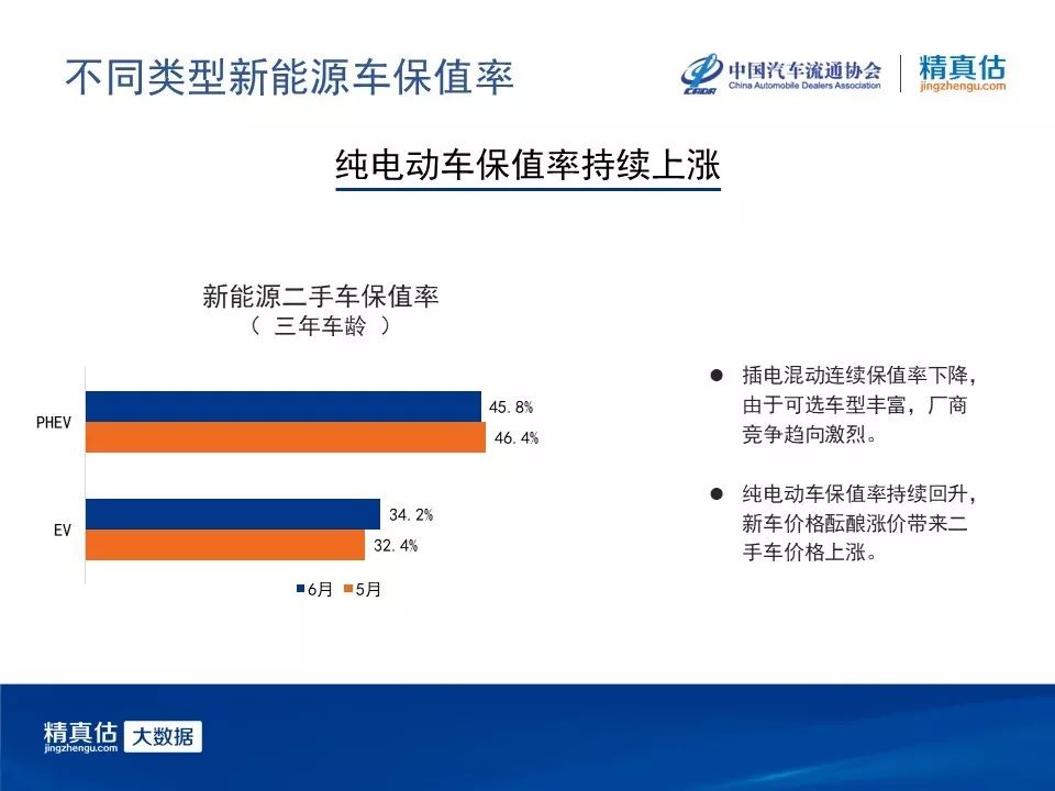 随着插电混动车型不断丰富,保值率也在持续下降,厂商之间的竞争日趋激烈;对比之下,纯电动车的保值率却持续回升。随着购车补贴政策的退坡,纯电动车的价格普遍上调,新车价格酝酿涨价带来了二手车价格上涨。