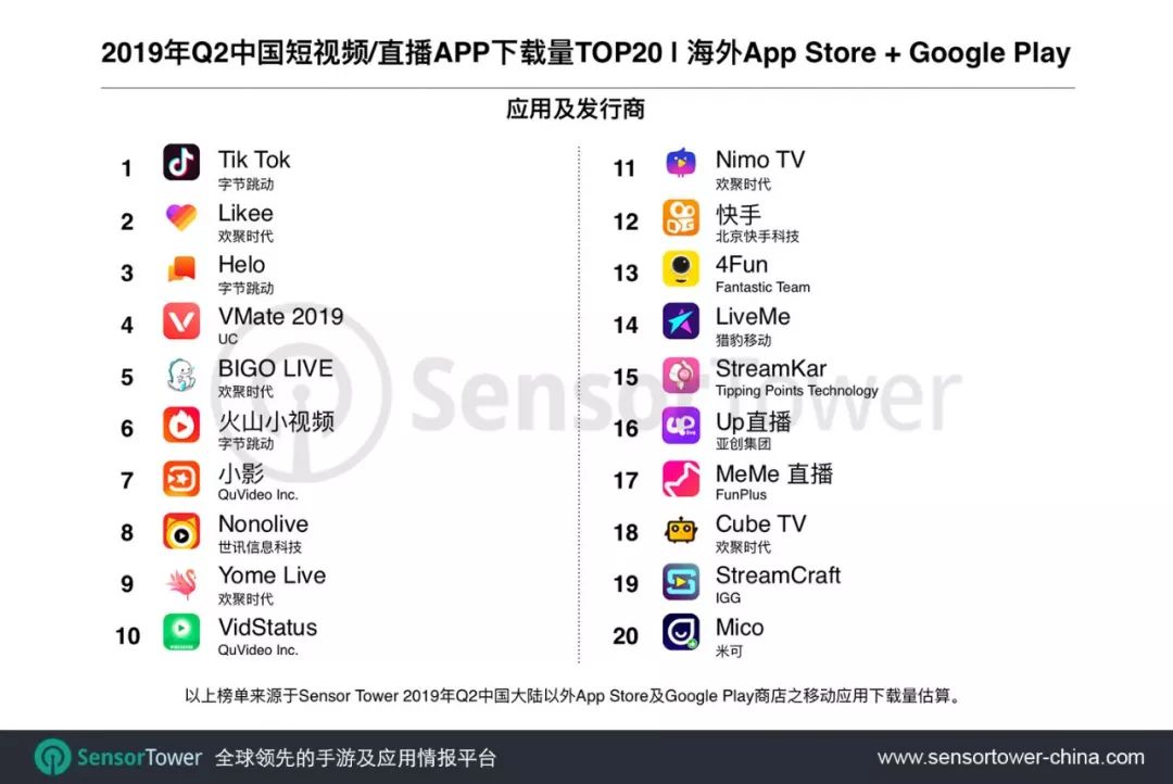 Sensor Tower 商店情报平台数据显示,2019年Q2期间,中国短视频/直播类应用,在中国大陆以外的 App Store 和 Google Play下载量及收入排名TOP20。