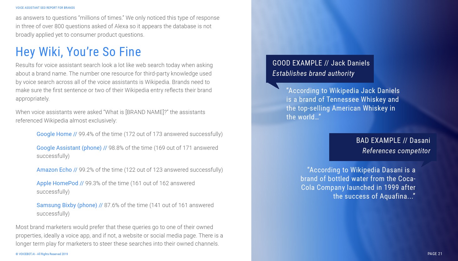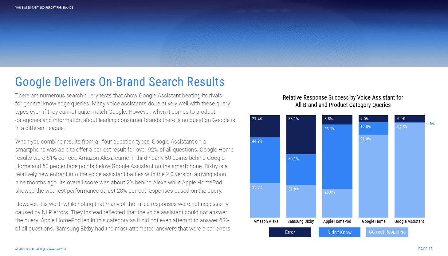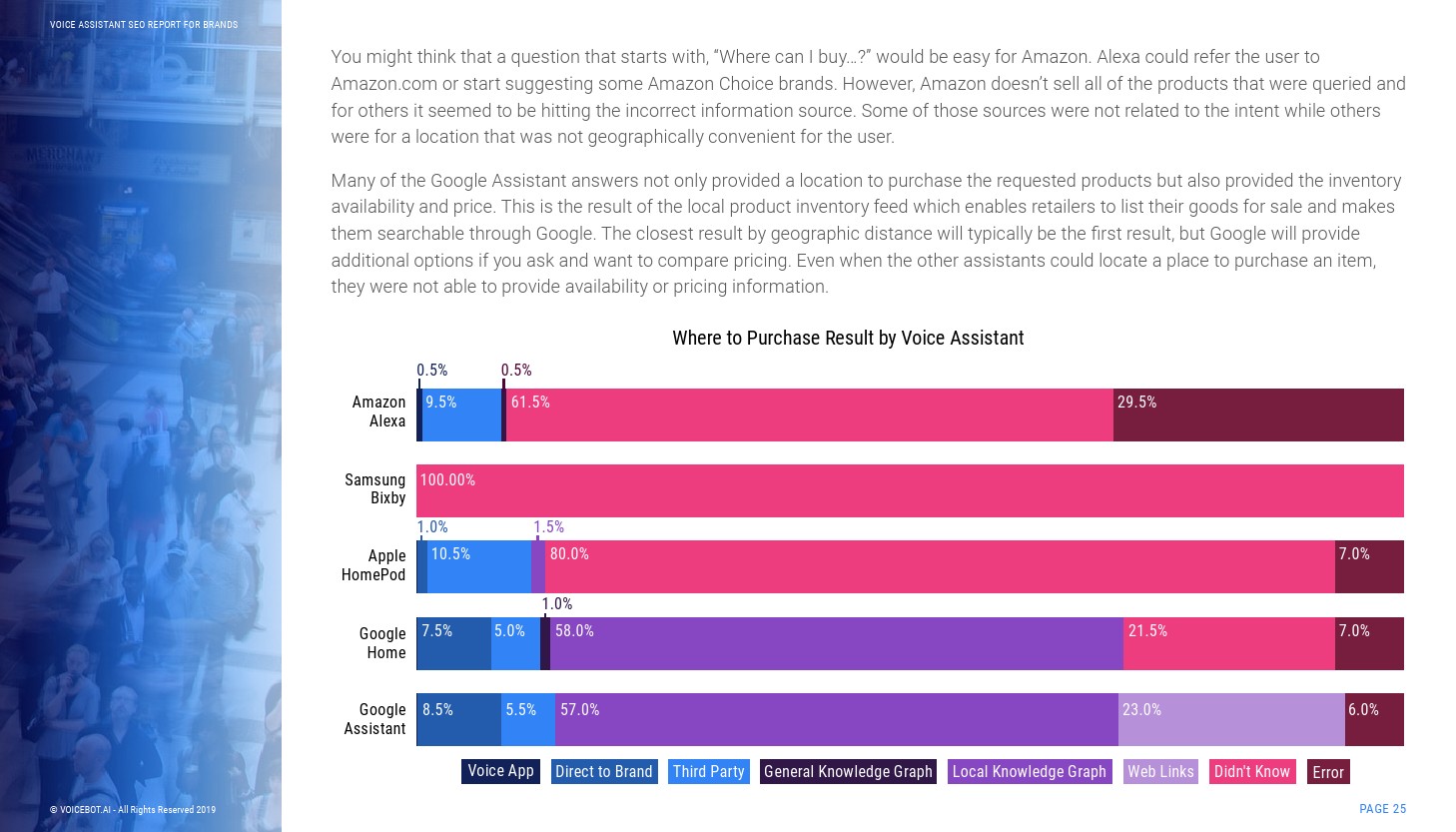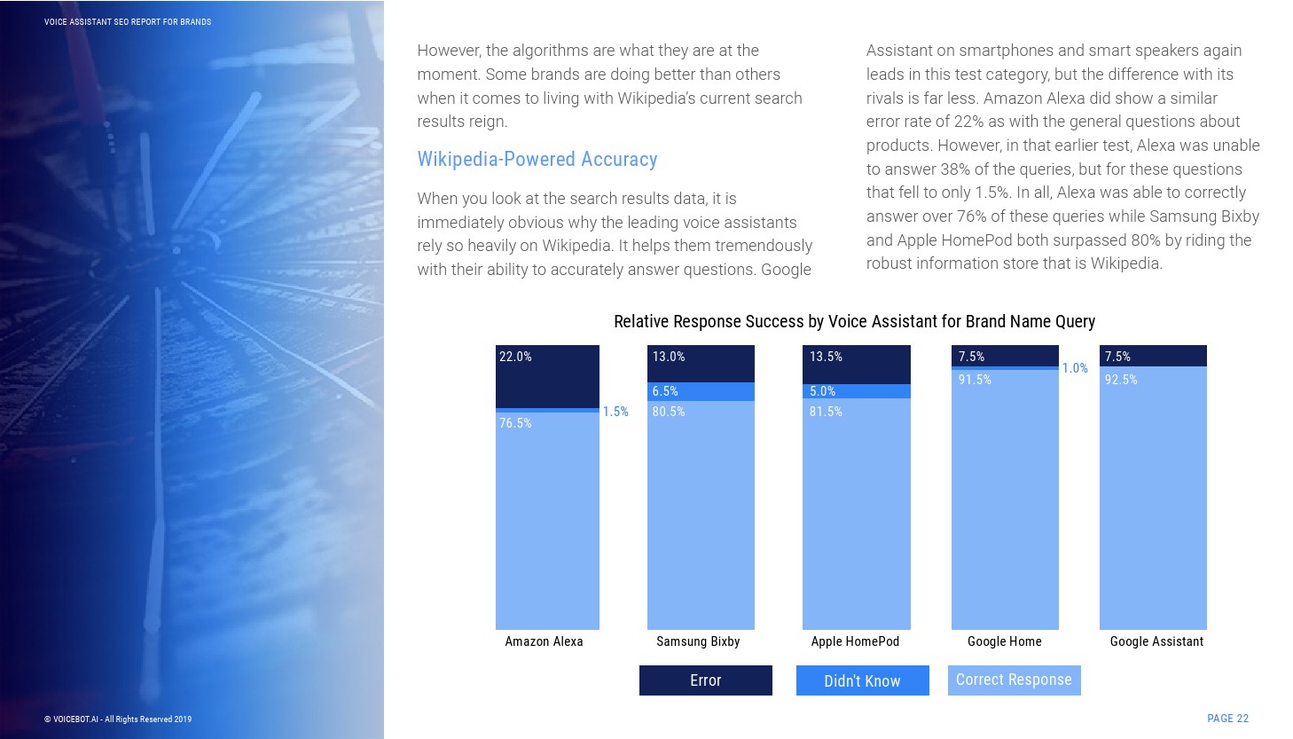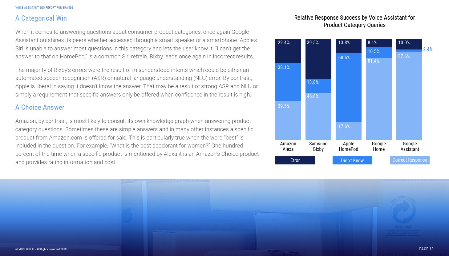 当你向语音助理询问超过4000个关于品牌和产品的问题时会发生什么?你会听到很多维基百科的条目。如果问题有位置角度,Yelp就是一个流行的数据源。然后是您的标准知识图响应,大部分来自Google,通常是特色片段,Google my Business information,或本地产品库存提要。如果你问苹果智能音箱问题,你最有可能听到的是,“对不起,我无法在HomePod上找到答案。”