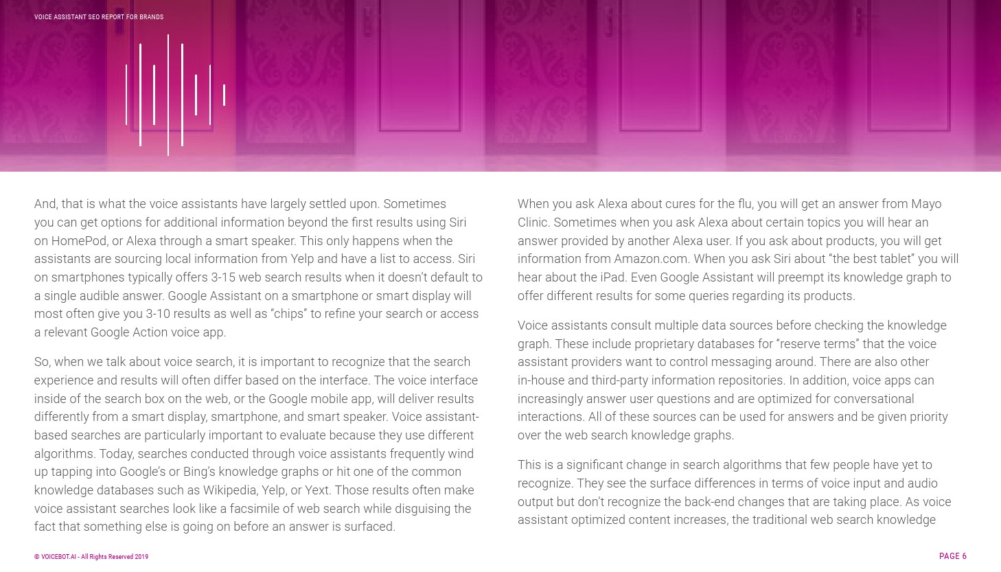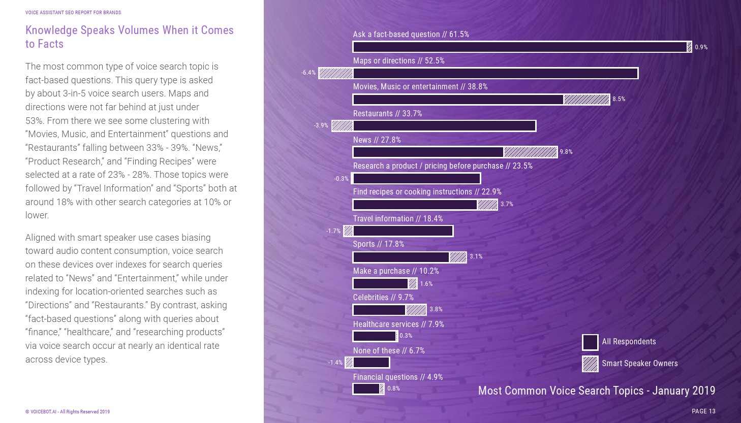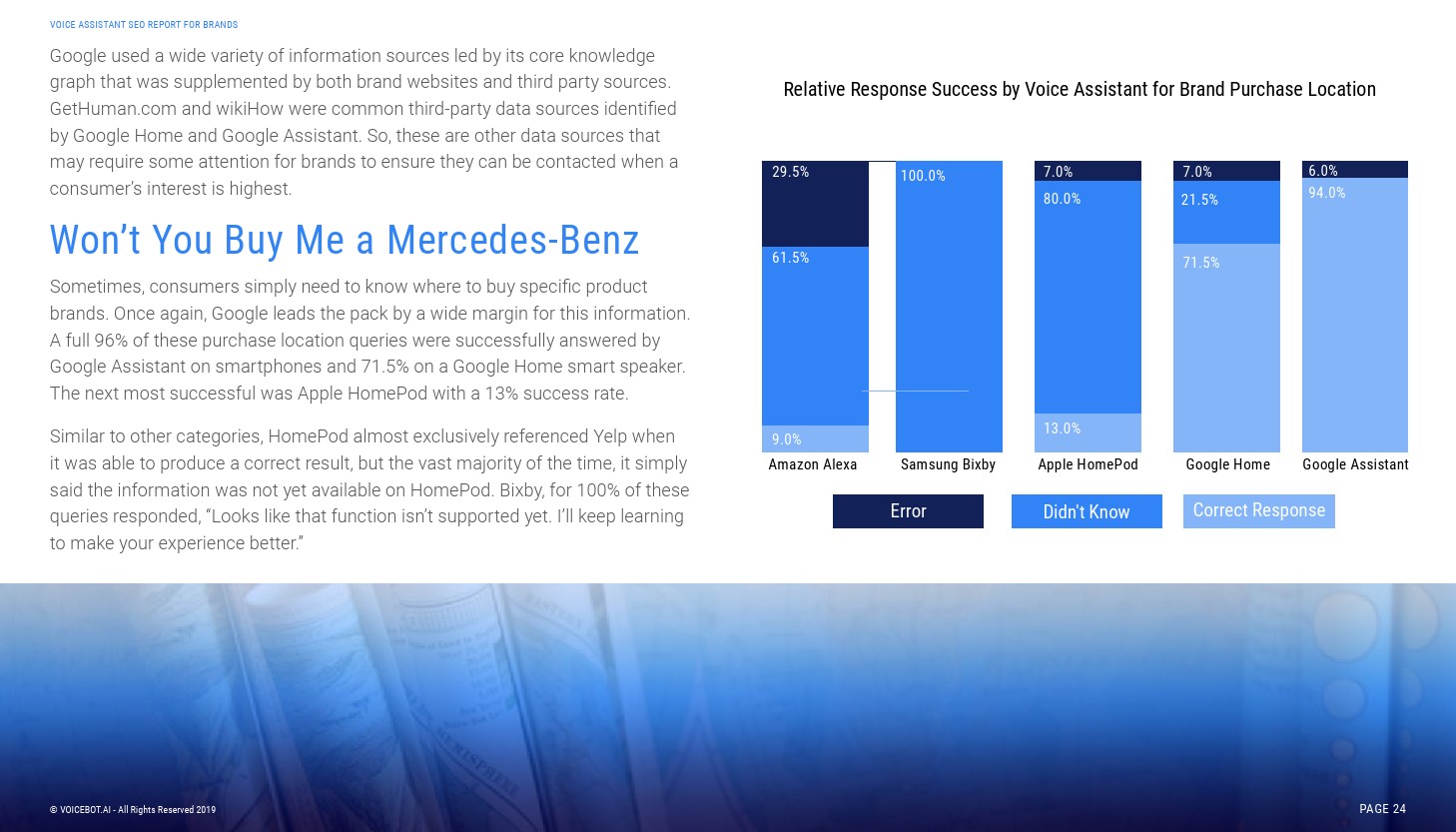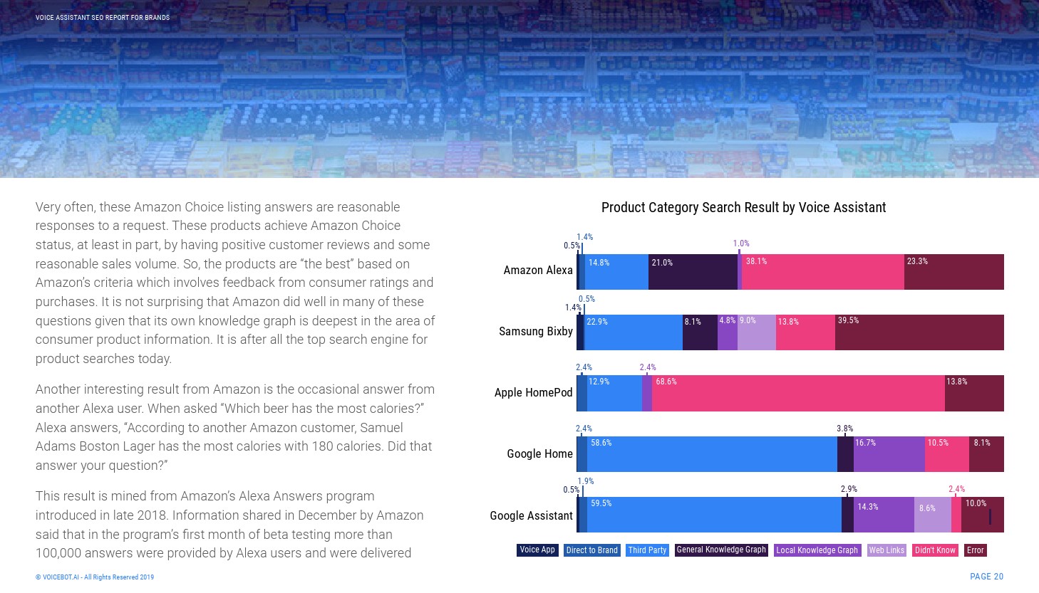 当你向语音助理询问超过4000个关于品牌和产品的问题时会发生什么?你会听到很多维基百科的条目。如果问题有位置角度,Yelp就是一个流行的数据源。然后是您的标准知识图响应,大部分来自Google,通常是特色片段,Google my Business information,或本地产品库存提要。如果你问苹果智能音箱问题,你最有可能听到的是,“对不起,我无法在HomePod上找到答案。”